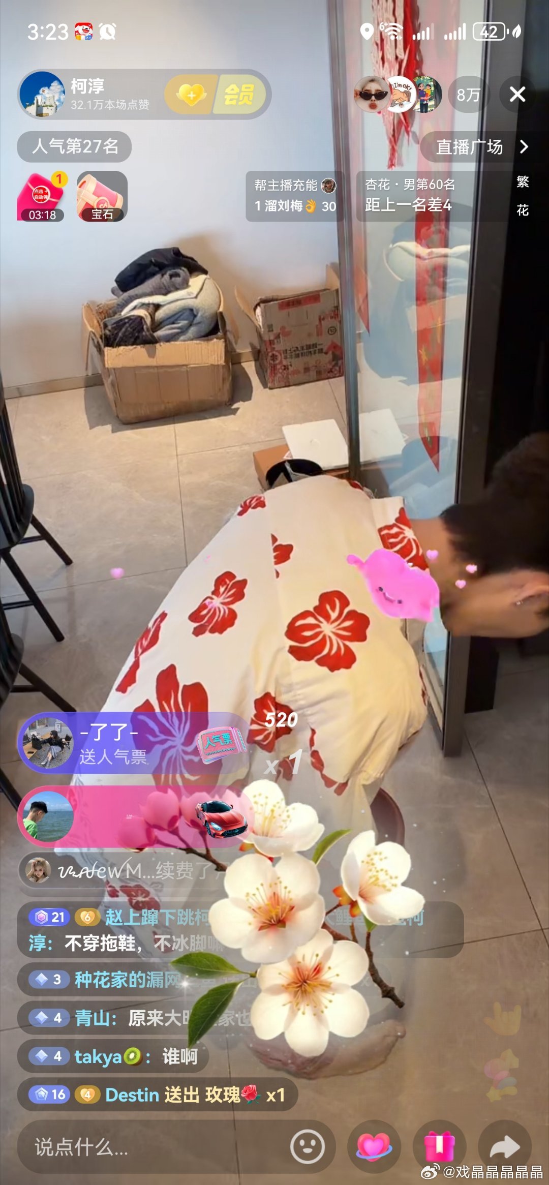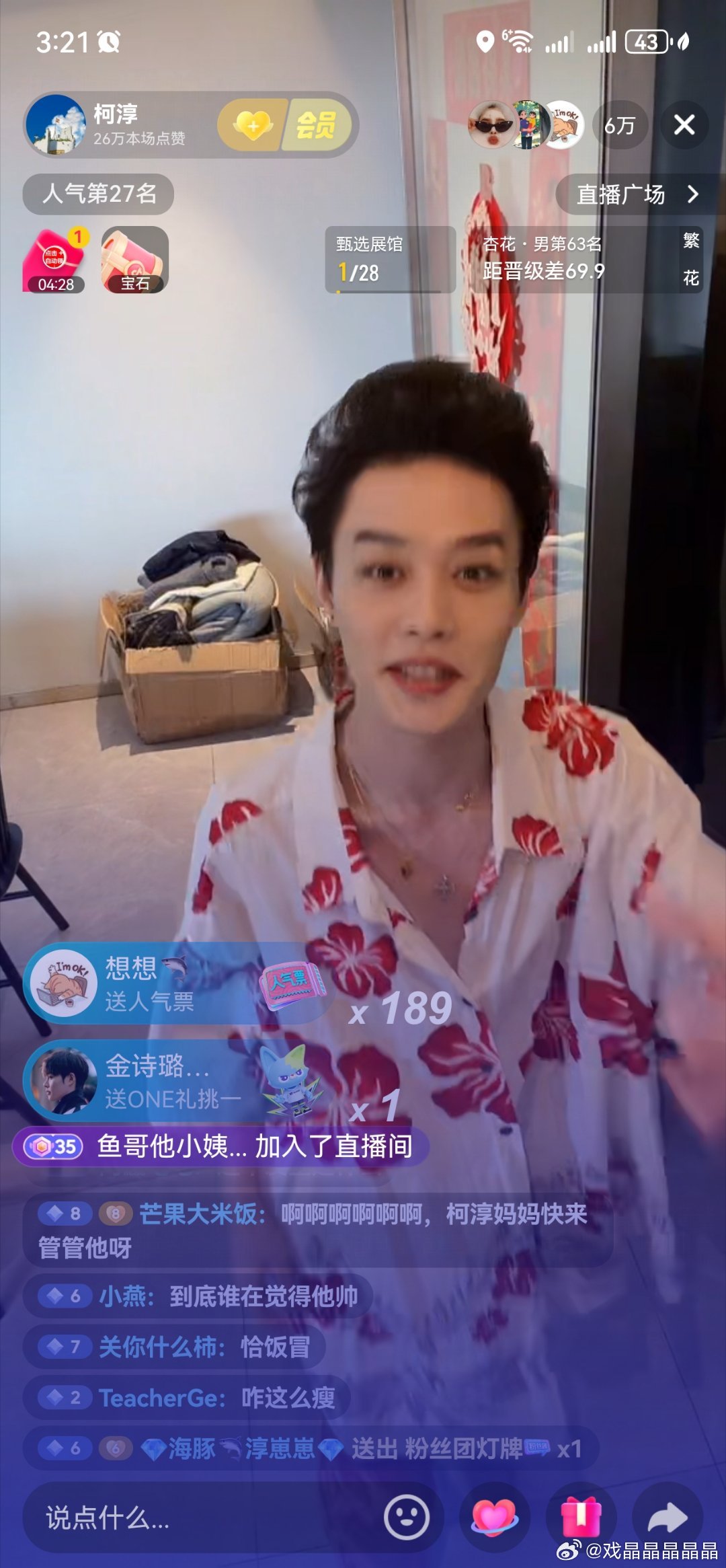 柯淳刚才又开直播了,柯淳粉丝快去吧,唱歌很好听 。一会儿就从五万飙到八万。