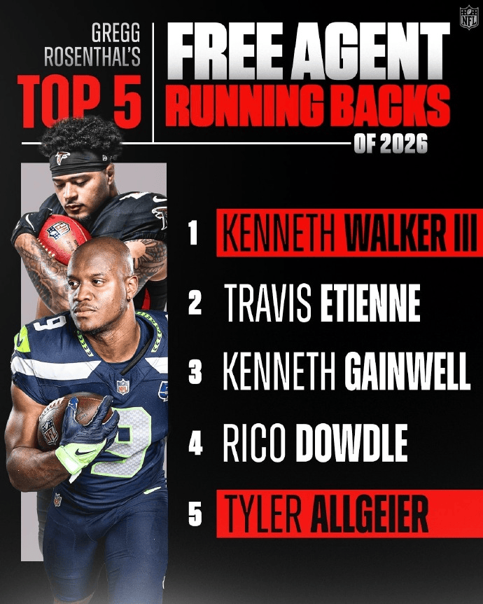 虎扑03月09日讯2026NFL自由球员市场即将开启。今日,NFL官方更新社媒,分享出资深分析师格雷格-罗森塔尔选出的各位置前五自由球员榜单。