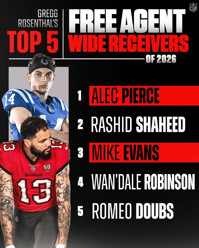 虎扑03月09日讯2026NFL自由球员市场即将开启。今日,NFL官方更新社媒,分享出资深分析师格雷格-罗森塔尔选出的各位置前五自由球员榜单。