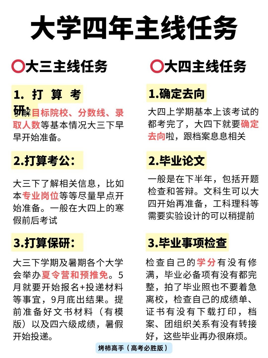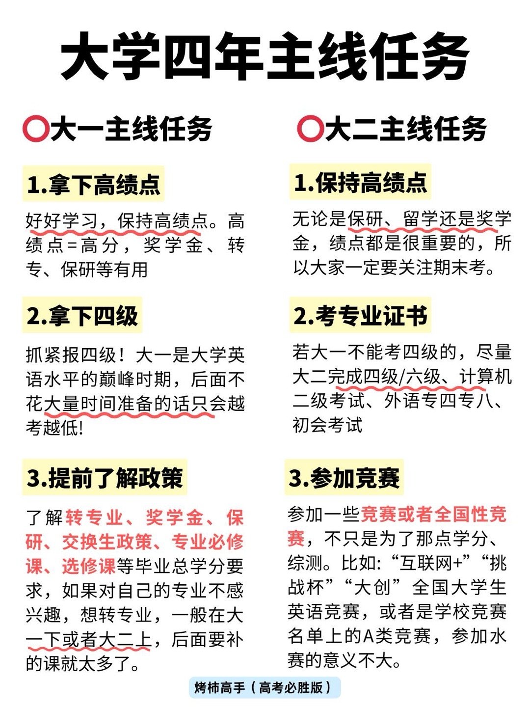 开学焕个新人设开学季 多希望我在入学前就知道这些大学主线任务!🌸大一主线任务1、拿下高绩点2、了解保研、奖学金等政策3、趁早考四六级4、参加一次竞赛5、可以参加学生会/社团6、不喜欢本专业尽早转🌸大二主线任务1、保持高绩点2、带队做创新创业类比赛3、考专业证书4、刷四六级成绩5、申请奖学金/荣誉称号🌸大三主线任务1、思考毕业去向(考公\考研\留学\保研)2、保研人寒假做什么?3、就业人怎么办?4、考研人寒假做什么?5、对照毕业要求查缺补漏🌸大四主线任务1、考研重要时间节点2、保研人重要时间节点3、就业人重要时间节点4、尽早完成毕业论文5、检查成绩单、档案是否处理妥当