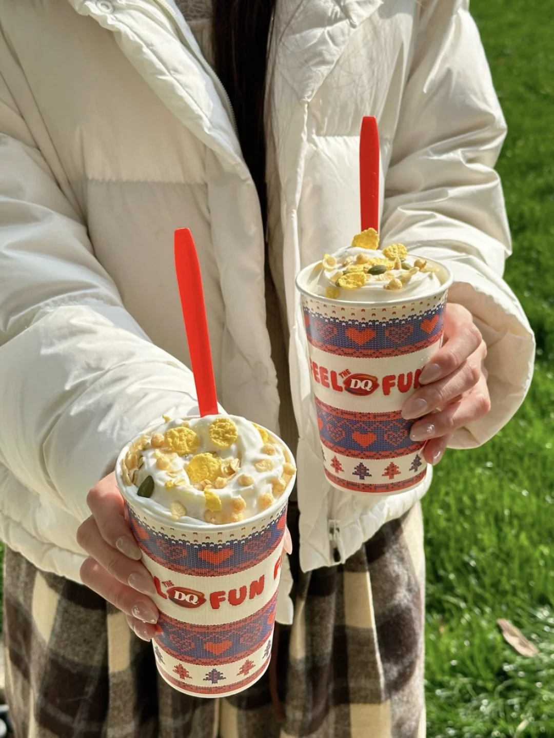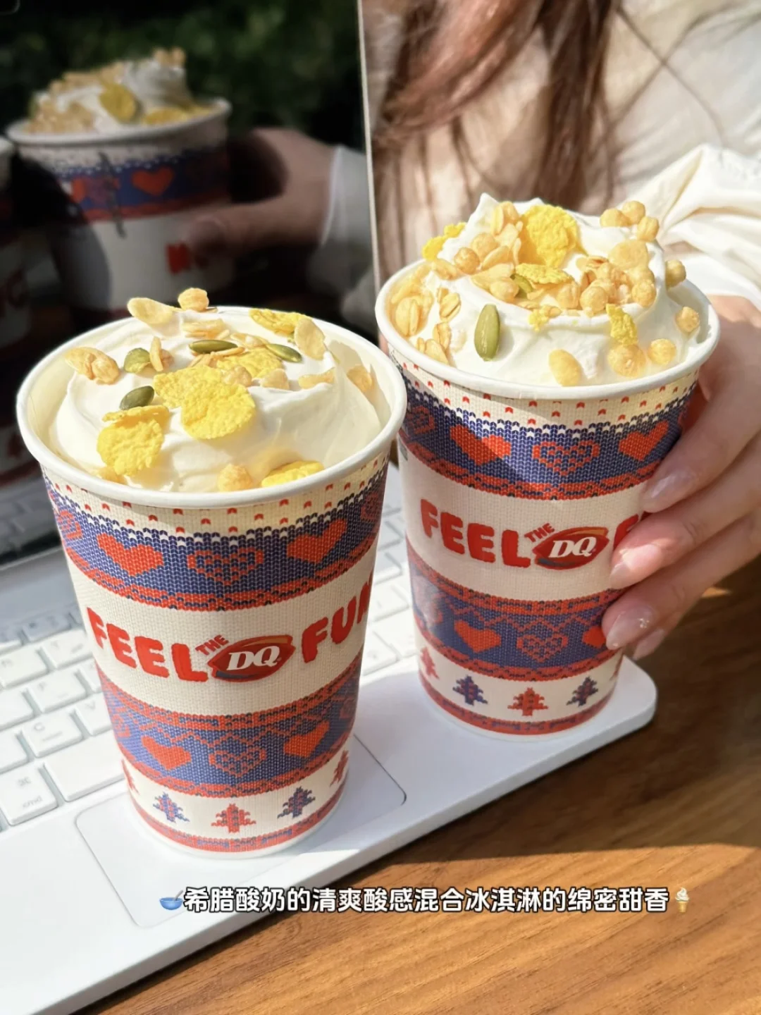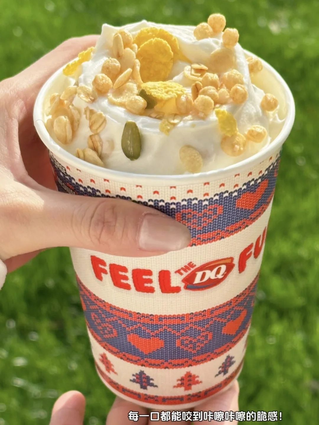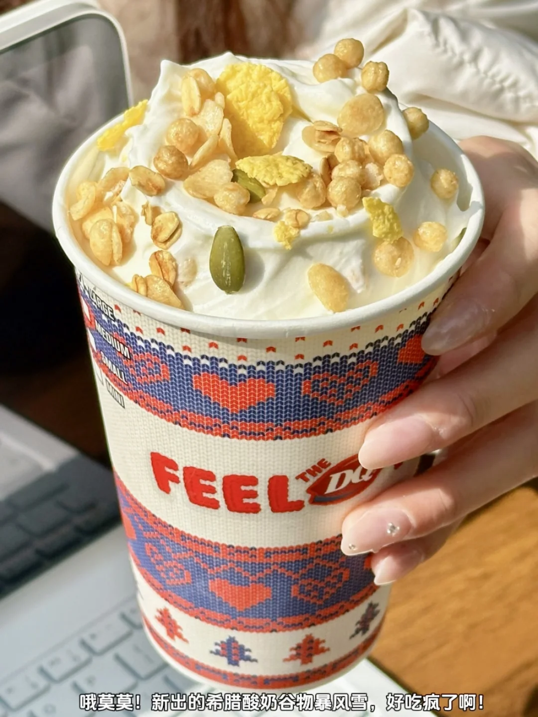 尊滴惊呆了啊!DQ的研发是没有瓶颈的吗?? 新出的希腊酸奶谷物暴风雪,好吃疯了啊!! 希腊酸奶的清爽酸感混合冰淇淋的绵密甜香🍦酸甜度刚好狠狠戳中我的味蕾!! 爱好不甜星人狂喜!一口下去奶香🥛超醇厚,口感绵密又扎实! 像在嚼冻得刚刚好的浓醇酸奶,越品越有味道! 混在里面的燕麦谷物片更是灵魂!!每一口都能咬到咔嚓咔嚓的脆感! 和绵密的冰淇淋搭配,口感层次直接拉满! 经典的倒杯不洒实力也依旧在线哈哈哈😆 好吃到一口直接封神了,家人们球球你们都去试试!