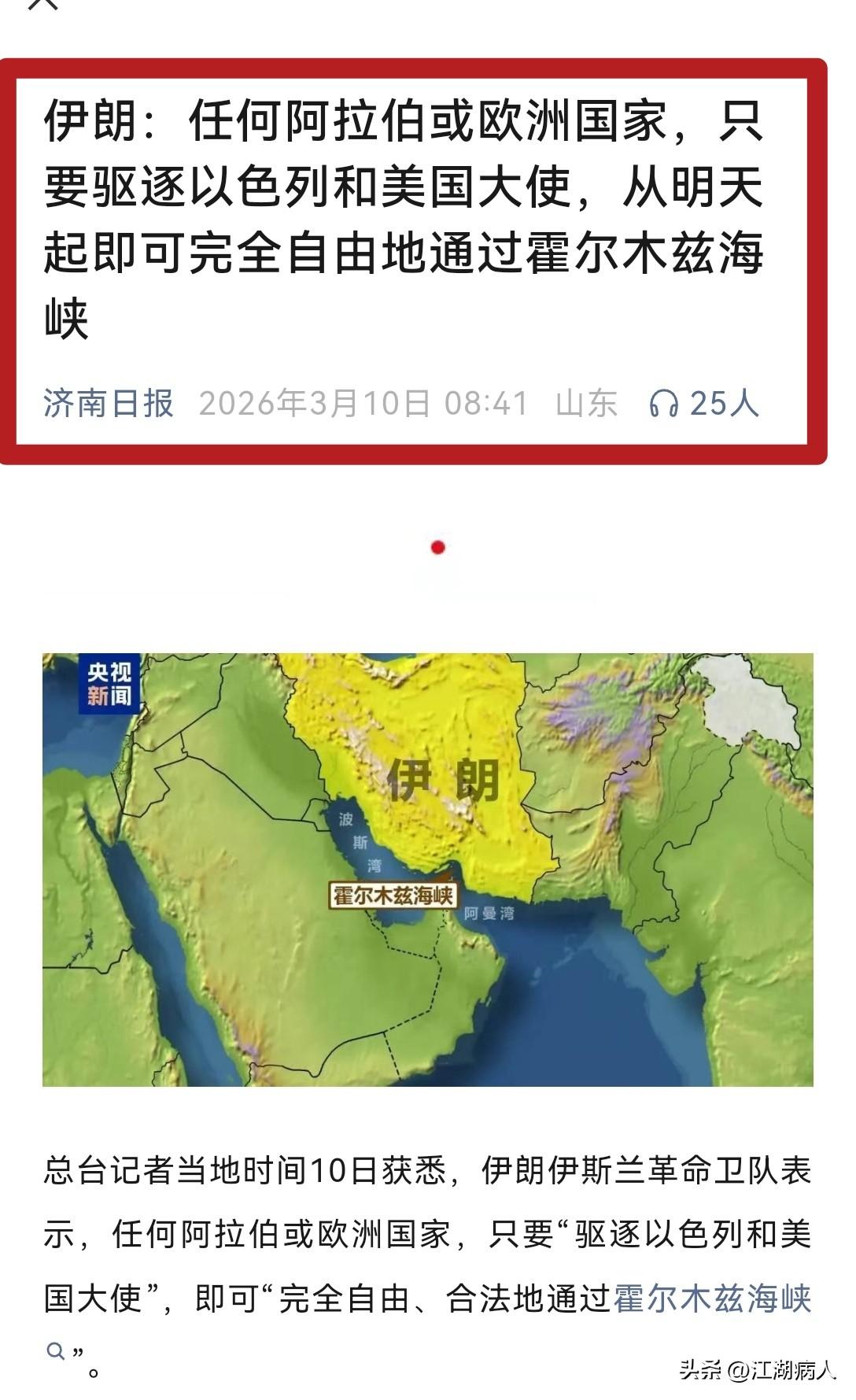 不得不说伊朗这一手太狠了:任何阿拉伯或欧洲国家,只要驱逐以色列和美国大使,从明天起即可完全自由地通过霍尔木兹海峡。伊朗这是抓准了欧洲和阿拉伯各国的命门了。自从美伊战争开始后,国际油价受局势影响迅速突破一百美元一桶。而现在最着急的无外乎欧洲国家与阿拉伯国家,一个需要石油拿不到,一个有油运不出。阿拉伯国家、欧洲国家广泛存在美军基地且与美国关系密切,伊朗这是逼这些国家同美国与以色列断绝关系。 当然我们可以确定的是,迫于美国的军事压力和经济实力以及盟友体系的约束,这些国家大概率会选择丢车保帅,不接受伊朗提出来的条件。伊朗也根本没指望这些国家能同意。伊朗只不过想通过这一举措告诉世界:我手里有牌,我有的是办法让你们难受。在一轮又一轮的斗争当中,伊朗在政治、外交层面的斗争手段和智慧不断提升,现在已经具备了和对手掰手腕的能力,且有能力左右地区局势。 当然,油价上涨对国际社会来说不是好事,我们追求的是和平,不是战争。但有些时候,为了赢得和平不得不付出代价,这个道理对伊朗通用,对我们更加适用。所以此次美伊战争,我们真要好好研究一下。