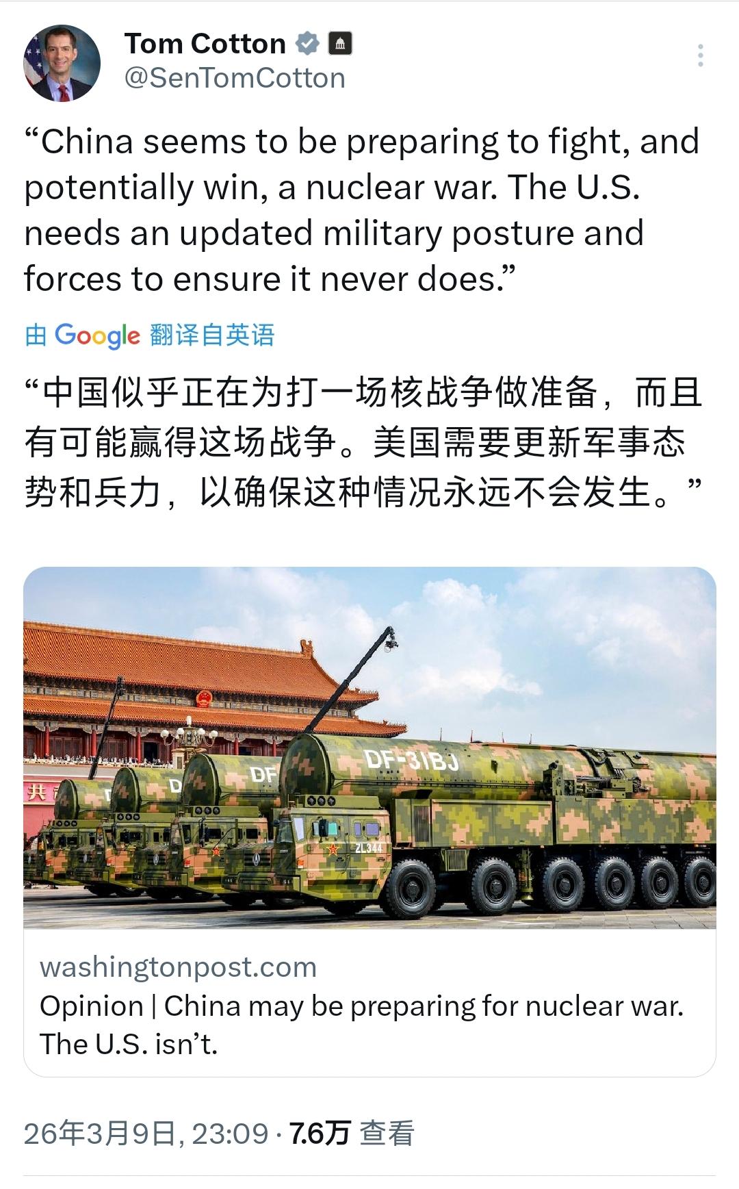 被我方制裁的美国共和党籍参议员汤姆·科顿昨晚(北京时间3月9日晚)写道:“中国似乎正在为打一场核战争做准备,而且有可能赢得这场战争。美国需要更新军事态势和兵力,以确保这种情况永远不会发生。” 说白了,科顿的言论,是典型的 “中国威胁论” 翻版。他刻意歪曲中国的核政策,把中国正常的国防建设,抹黑成准备发动核战争的野心,逻辑完全站不住脚。 要知道,中国的核政策从始至终都非常清晰。自 1964 年拥有核武器那天起,中国就郑重承诺,任何时候、任何情况下都不首先使用核武器,也无条件不对无核国家和无核区使用或威胁使用核武器。中国发展核力量,唯一目的是自卫,是遏制他国对中国使用核武器,从来不是为了打赢核战争。 事情还不止如此,科顿的言论,完全无视基本事实。中国始终将核力量维持在国家安全需要的最低水平,不与任何国家搞核军备竞赛,这和美国拥有全球最大核武库、奉行首先使用核武器政策,形成了鲜明对比。 但麻烦的是,美国政客总爱用这种套路。他们自己不断投入巨资升级核武库,甚至想重启核试验,却反过来指责别国,把自己塑造成 “受害者”,目的就是为自己扩军备战、破坏全球战略稳定找理由。 然而这么一来,科顿的言论只会带来一个后果,那就是加剧全球核风险。他的话本质是在煽动对立,推动美国进一步增加军费、升级核力量,让本就紧张的国际安全局势,变得更加危险。 抛开表面看,这里头藏着美国的霸权逻辑。在美国一些政客眼里,别国发展国防就是威胁,自己拥有绝对军事优势才叫安全。这种双重标准,才是全球战略稳定的最大乱源。 事实上,中国一直是国际核秩序的维护者。我们积极参与核军控对话,恪守暂停核试验承诺,推动全面禁止和彻底销毁核武器。反观美国,才是不断毁约退群、破坏全球核裁军进程的一方。 而这种颠倒黑白的炒作,着实让人感到荒谬。科顿作为被中方制裁的政客,发表这类言论,不过是为了迎合美国国内的反华势力,博取政治资本,完全不顾及全球和平与安全的大局。 更值得警惕的是,这类言论会误导美国民众和国际社会。它让人们忽视真正的核威胁来源,反而把矛头指向坚持和平发展的中国,这对全球核安全没有任何好处。 说实话,美国政客的这种操弄,最终只会反噬自身。沉迷于扩军备战、制造对抗,只会让美国陷入更深的安全困境,也会让全球为此付出沉重代价。 说到底,科顿的言论毫无道理。中国的核政策光明磊落,目的是自卫而非战争。真正该反思的,是那些抱着冷战思维、不断渲染威胁、推动军备竞赛的美国政客。停止抹黑中国、切实履行核裁军责任,才是维护全球战略稳定的正道。 以上是小编个人看法,如果您也认同,麻烦点赞支持!有更好的见解也欢迎在评论区留言,方便大家一同探讨。