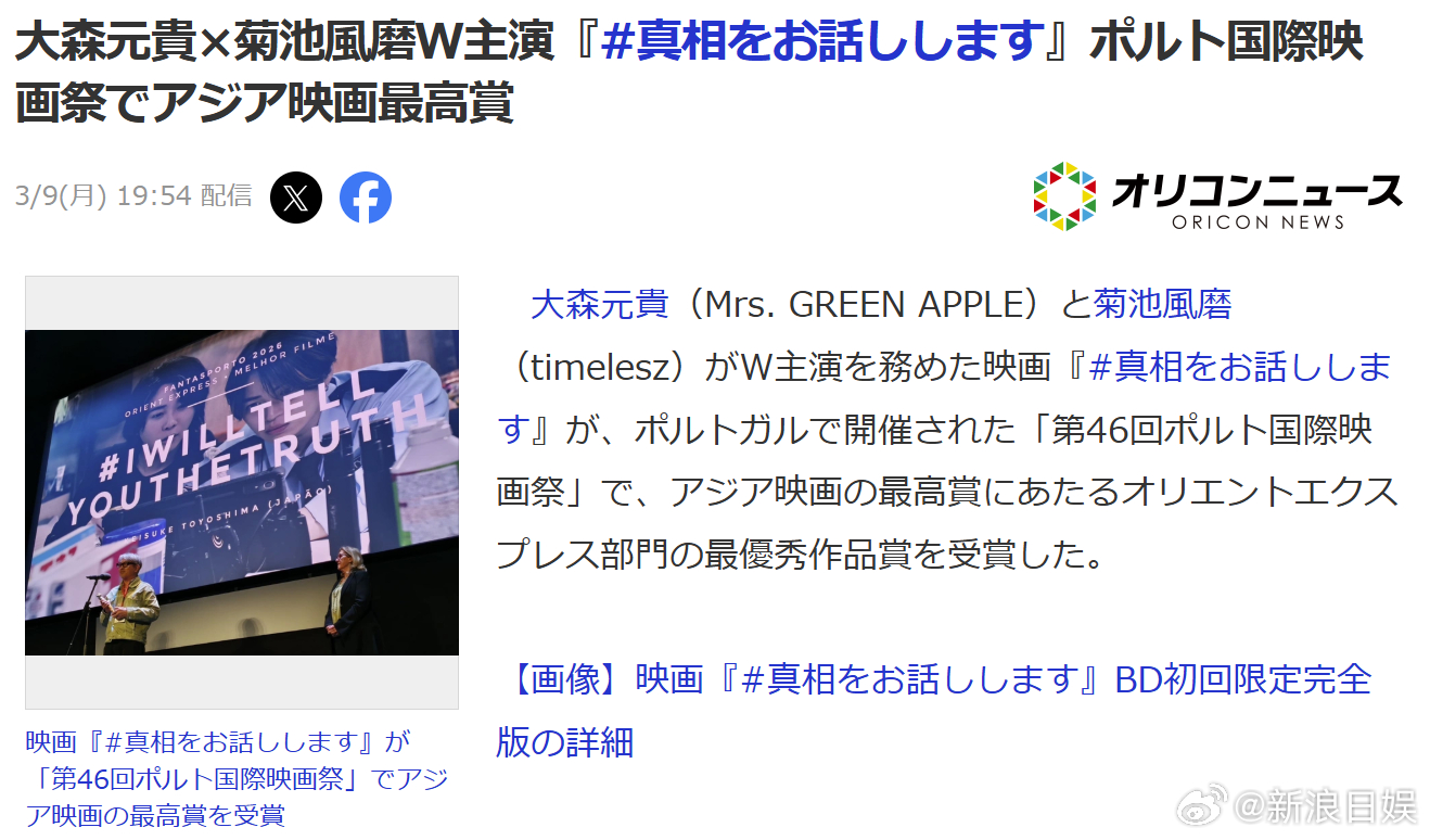 大森元贵菊池风磨双主演电影《我来说出真相》在葡萄牙举办的第46届波尔图国际电影节上获得了东方快车单元最佳影片奖。