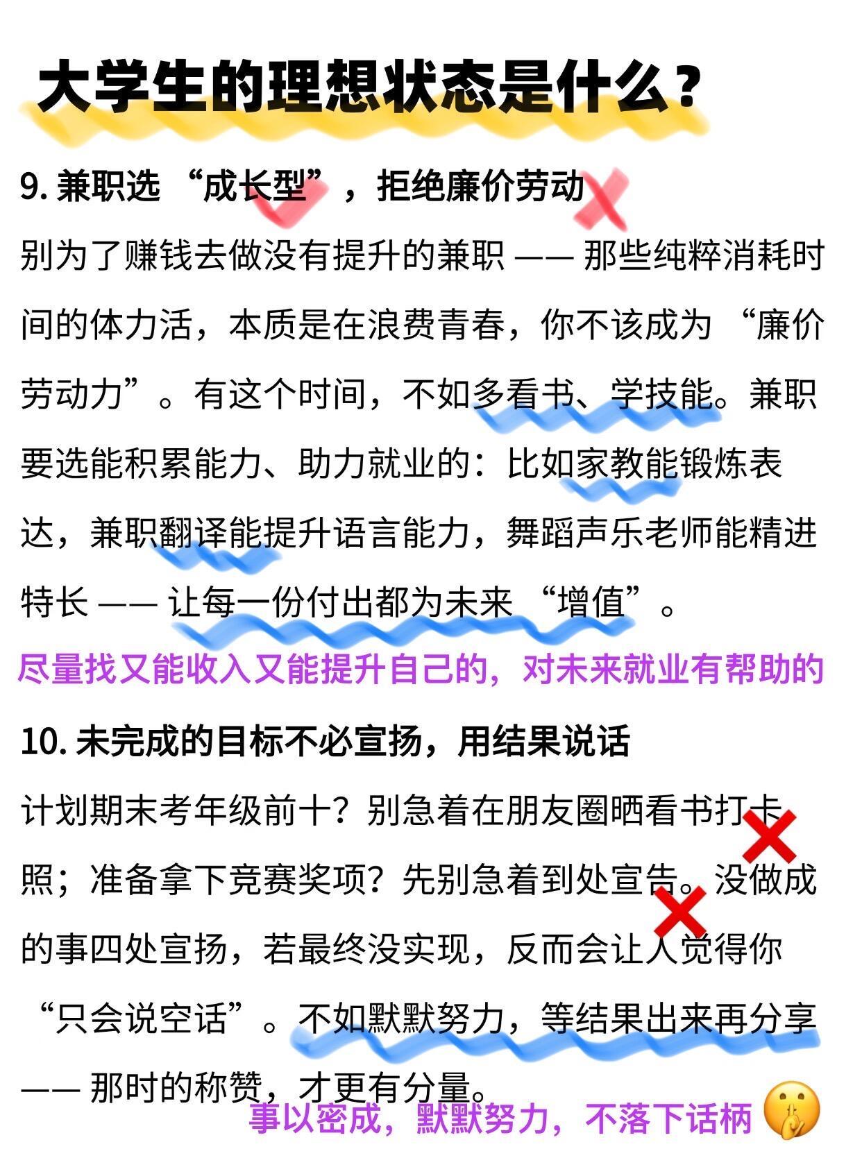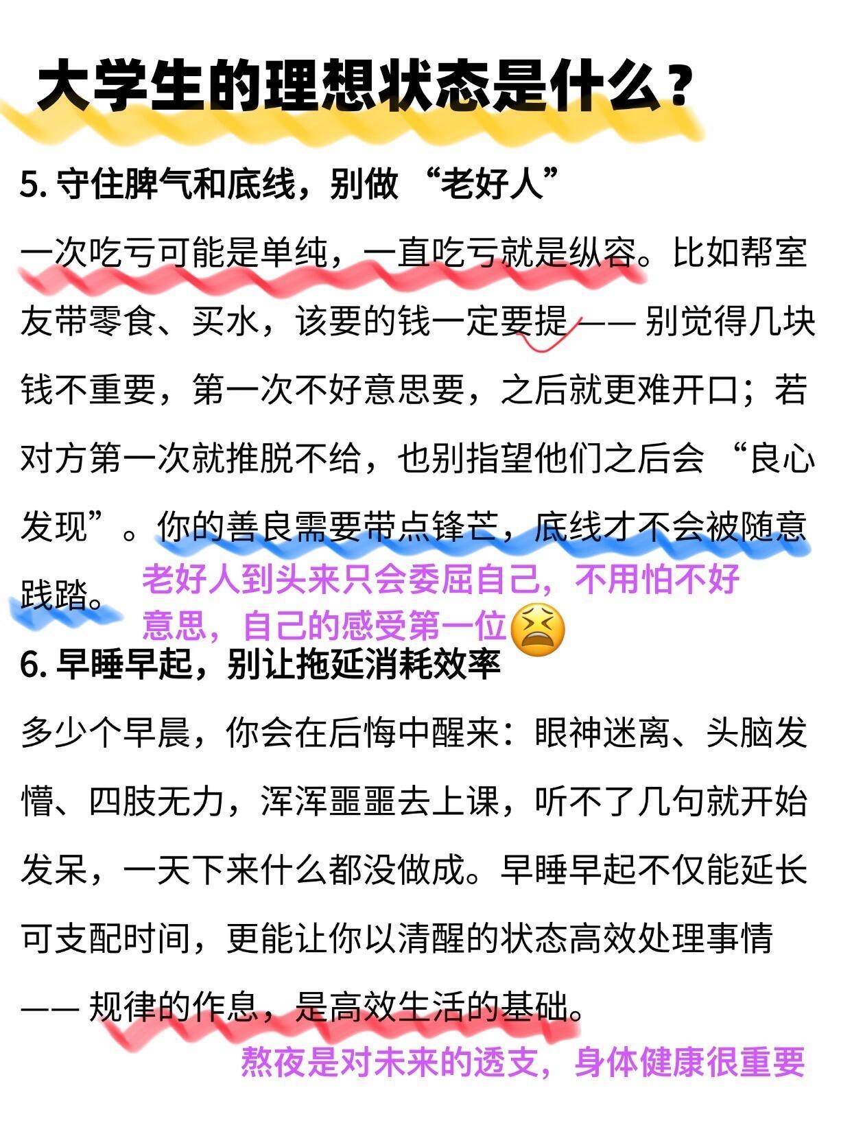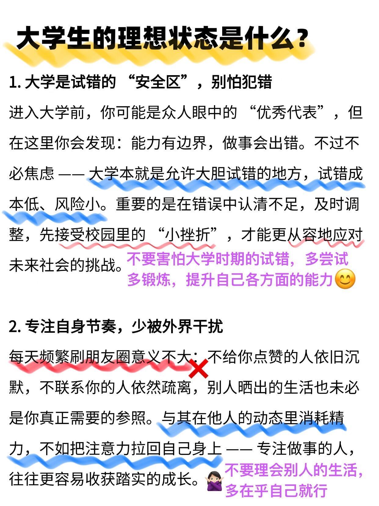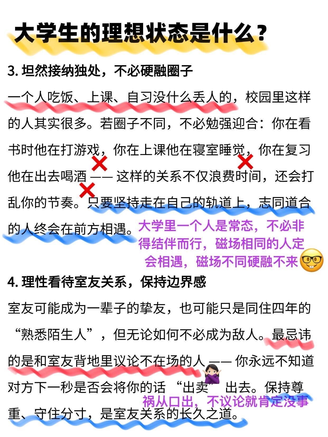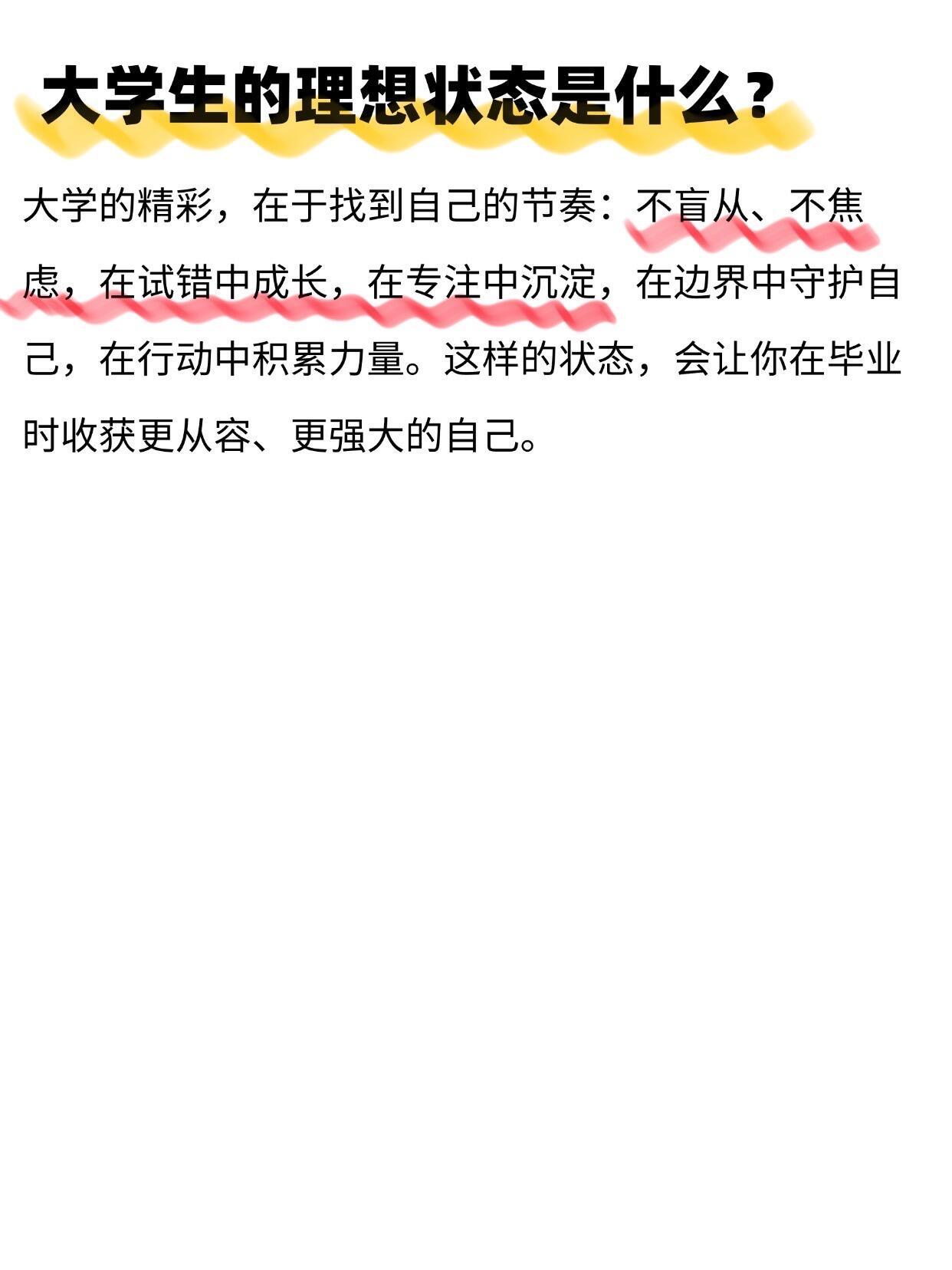 开学焕个新人设大学生 🔥原来这才是大学生的理想状态宝子们别再迷茫啦~大学四年抓准这几点轻松逆袭独处不尴尬,圈子不同别硬融;室友处成朋友是幸运,处不成也别结仇;早睡早起,没课别瘫寝室,图书馆 / 操场 / 学技能随便选不焦虑不盲从,按自己节奏成长,学会悄悄努力等结果惊艳所有人,毕业一定超感谢现在的你开学季