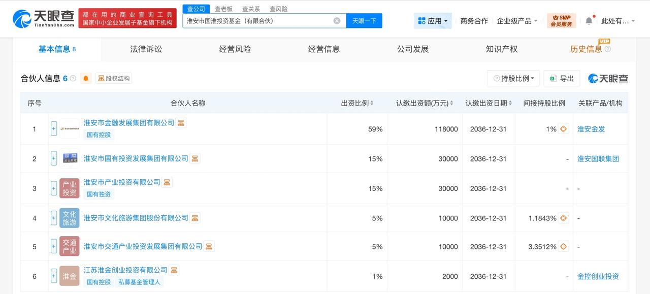 淮安市国淮投资基金登记成立 出资额20亿 天眼查工商信息显示,近日,淮安市国淮投资基金(有限合伙)成立,执行事务合伙人为江苏淮金创业投资有限公司,出资额20亿人民币,经营范围包括创业投资、股权投资等。合伙人信息显示,该基金由淮安市金融发展集团有限公司、淮安市国有投资发展集团有限公司、淮安市产业投资有限公司、淮安市文化旅游集团股份有限公司、淮安市交通产业投资发展集团有限公司、江苏淮金创业投资有限公司共同出资。 天眼查信息: