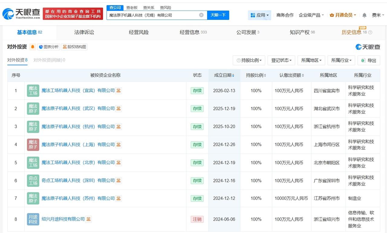 魔法原子近半年成立多家新公司 魔法原子去年底完成增资 魔法原子近期完成高管变更 魔法原子商业版图盘点 据媒体报道,近日,魔法原子宣布完成5亿元融资,投资机构包括天空工场创投基金、拓普集团等。 天眼查工商信息显示,魔法原子机器人关联公司魔法原子机器人科技(无锡)有限公司成立于2023年12月,经营范围包括智能机器人的研发、工业机器人制造、工业机器人销售等。股东信息显示,该公司由魔法工场(无锡)科技有限公司全资持股。变更记录显示,近期,该公司发生工商变更,创始人吴长征卸任法定代表人,由陈春玉接任。去年12月,该公司注册资本由1000万人民币增至1亿人民币。对外投资信息显示,该公司对外投资8家企业,去年10月以来,该公司成立了魔法工场机器人科技(宜宾)有限公司、魔法原子机器人科技(武汉)有限公司、魔法原子机器人科技(杭州)有限公司。 天眼查信息: