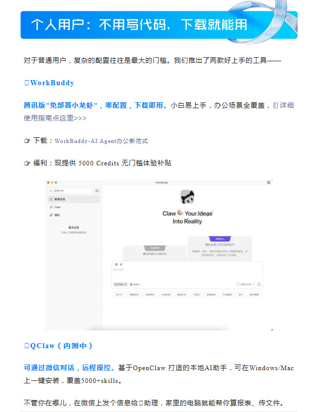 【#腾讯龙虾特工队来了# 】#腾讯龙虾矩阵支持一键养虾# 今天,腾讯的“龙虾特工队“来了。支持大众用户、开发者、企业级用户一键“养虾🦞”。这不只是一个会说话的聊天框,而是具备持续记忆与实际任务执行能力的自动化行动特工(Agent)。整理附上领养指南👇,无论你是哪类用户,这里都有一只为你量身定制的“小龙虾”。#腾讯龙虾特工队# 网页链接