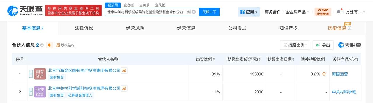 北京中关村科学城成果转化创业投资基金成立 出资额20亿 天眼查工商信息显示,近日,北京中关村科学城成果转化创业投资基金合伙企业(有限合伙)成立,执行事务合伙人为北京中关村科学城科技投资管理有限公司,出资额20亿人民币,经营范围为私募股权投资基金管理、创业投资基金管理服务。合伙人信息显示,该基金由北京市海淀区国有资产投资集团有限公司、北京中关村科学城科技投资管理有限公司共同出资。 天眼查信息: