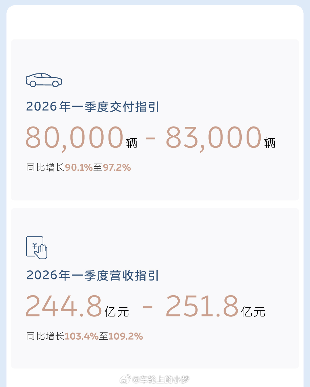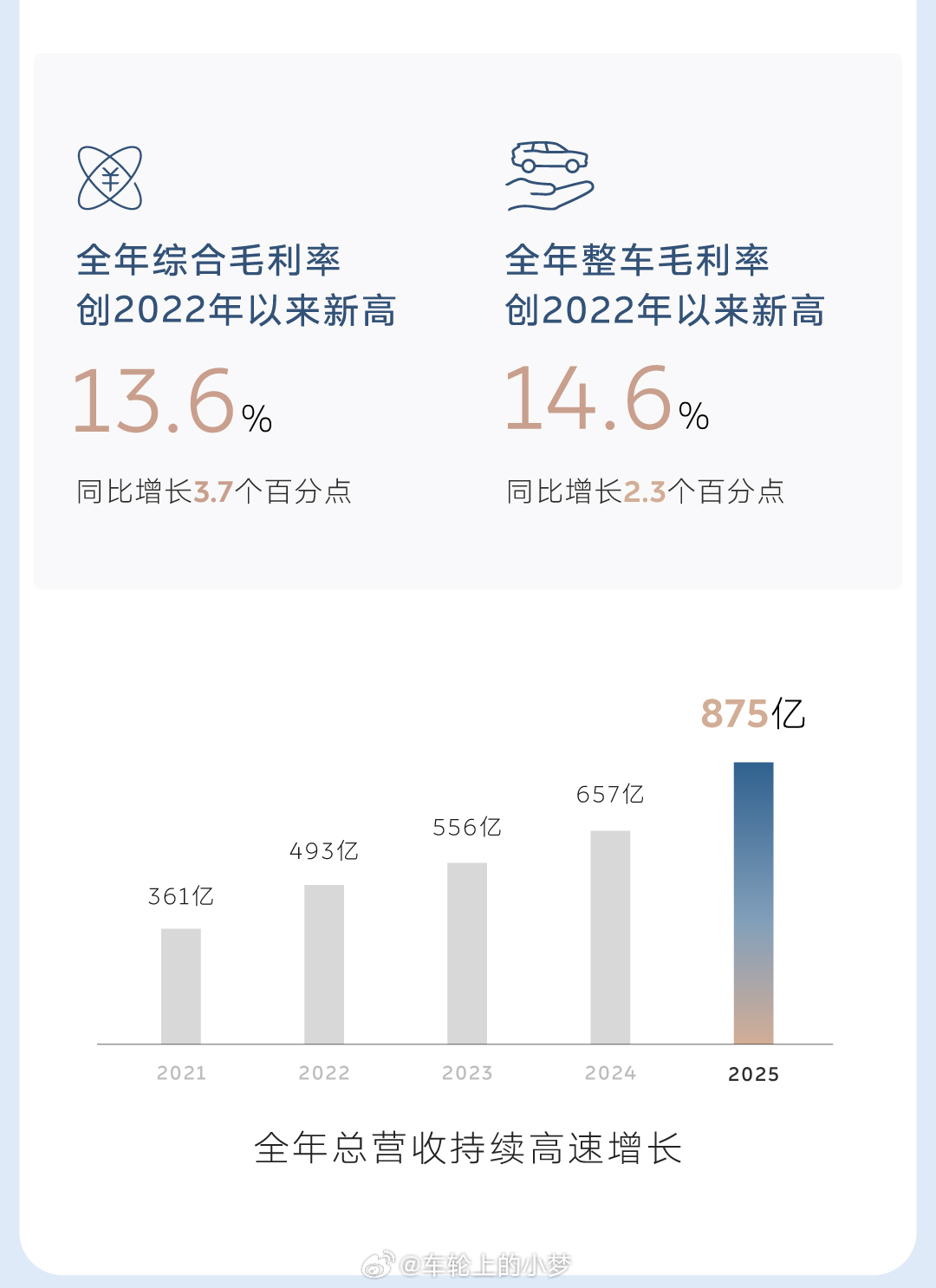 蔚来发了2025年四季度财报,挺亮眼。季度经营利润12.5亿,第一次盈利了,现金储备459亿,涨了近一百亿。四季度交付12.4万台,同比增71.7%,营收346.5亿,毛利60.7亿,整车毛利率18.1%,创三年新高。全年交付32.6万台,营收874.9亿,刷新了纪录。今年一季度交付指引8万到8.3万台,同比几乎翻倍,营收预计245亿到252亿,增长超一倍。李斌表示,这波盈利说明技术、产品和模式都站住脚了,公司进第三阶段,要开始新一轮高速增长。小梦有机会去试驾感受感受去~小梦说车
