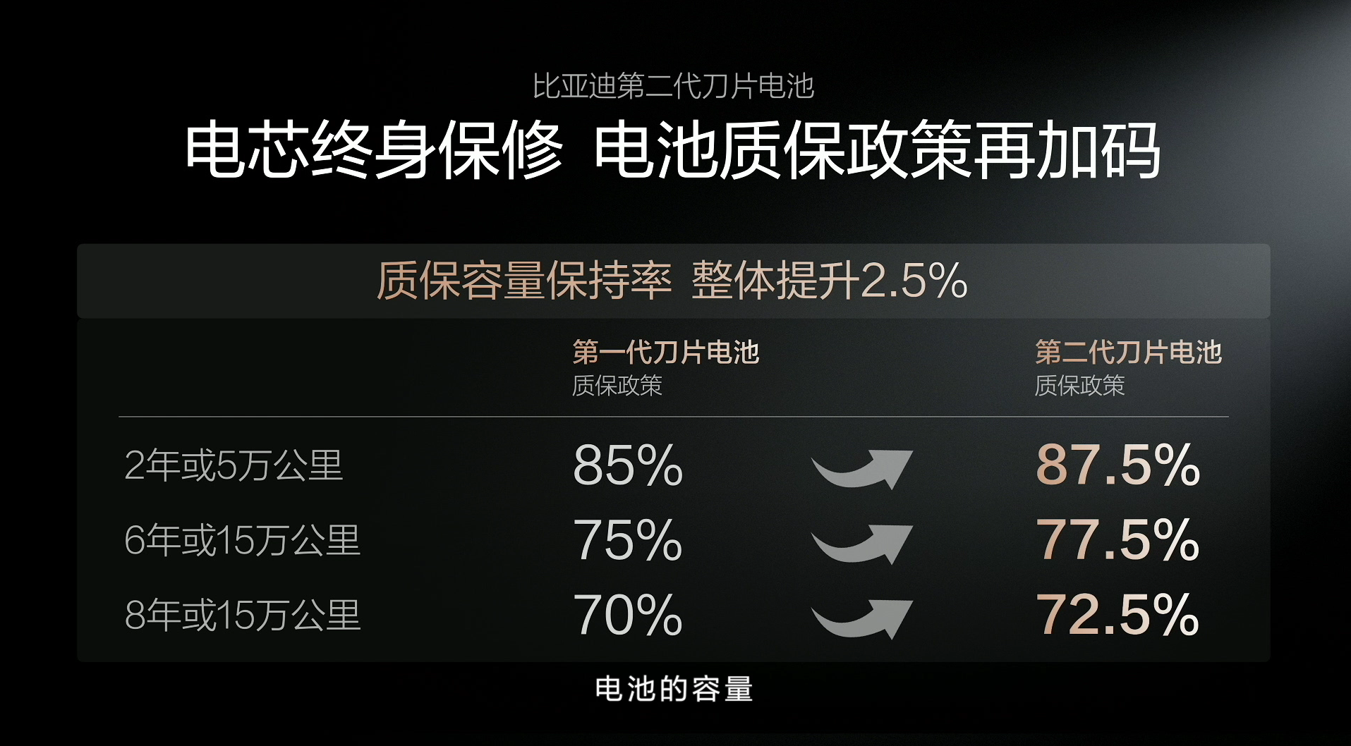 比亚迪第二代刀片电池直接实现闪充与长寿命兼得,靠锂离子高速通道和全温域智能热管理系统,让闪充少产热、快散热,对电池寿命几乎没影响,还比第一代刀片电池寿命更长。500 次闪充循环后做针刺试验,电池依旧无热失控、不冒烟起火,妥妥的安全耐用。而且电池质保政策再加码,容量保持率提升 2.5%,低于 77.5% 就免费包换,电芯终身保修,这份底气就是最好的证明。