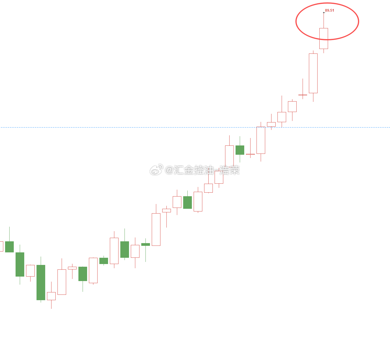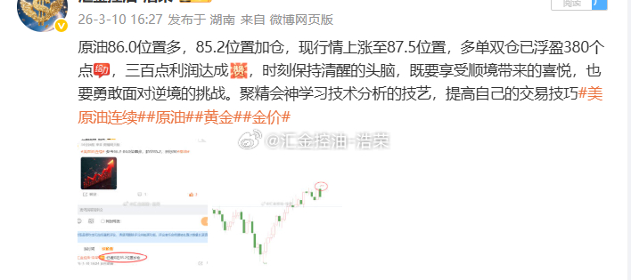原油86.0位置多,85.2位置加仓,行情上涨至89.5位置,多单双仓止盈780个点,等不到90位置就不等了,七百点利润落袋为安,实力从不需要华丽的语言来证明,利润即回声。美原油连续原油黄金金价