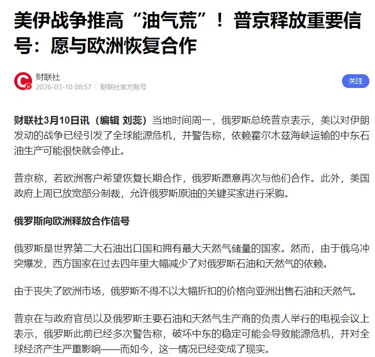 普京:莫斯科不应坐视欧洲在能源供应问题上“当众摔门” 3月9日,俄罗斯总统普京开了个能源相关的会,针对欧洲买能源的事,说了句实在话。 简单说就是,俄罗斯愿意继续给欧洲卖石油、天然气,但欧洲得有合作的诚意,不能一边不买,一边还摆架子,俄罗斯不会一直等着。 以前啊,俄罗斯和欧洲在能源上关系特别好,互相离不开。欧洲要发展工业,需要大量便宜又稳当的能源,俄罗斯正好有很多石油天然气,靠卖能源赚钱也是俄罗斯主要的路子。 那时候,欧洲大部分天然气都是从俄罗斯买的,很多欧洲国家离了俄能源都不行,双方合作了很多年,都能占到便宜。 可从2022年俄乌冲突开始,一切就变了。欧洲跟着美国制裁俄罗斯,重点就卡能源这块,慢慢减少从俄罗斯买能源,还把输气的北溪管道炸了,彻底断了能源通道。 到后来,欧洲从俄罗斯买的天然气,比以前少了一大半,双方的生意也凉了不少。 最关键的是,今年1月,欧洲27个国家一起通过了规定,说要逐步禁止买俄罗斯的天然气,再过一两年就彻底不让买了。 这就是普京说的“当众摔门”,明明以前离不了俄能源,现在说断就断,一点情面都不留,也不考虑俄罗斯的难处。 普京说不能看着欧洲这么“摔门”,其实就是不想被动吃亏。卖能源是俄罗斯赚钱的主要路子,欧洲以前是最大的买家,现在欧洲不买了,要是俄罗斯不赶紧找新买家,能源卖不出去,钱就少了,国内老百姓的日子也会受影响,所以只能转头找其他有需求的国家。 有人可能会问,俄罗斯能找到新买家吗?肯定能,而且现在已经在找了。这些年,俄罗斯一直往亚洲这边找市场,中国和印度就是主要的新买家。现在俄罗斯大部分石油,都卖给了中国和印度,卖给欧洲的已经很少了。 除了中国和印度,俄罗斯还在找土耳其、非洲等地方的买家,慢慢拓展新市场,这样就不用再靠欧洲,也有了底气。 而且普京也说了,不是彻底不跟欧洲合作,只要欧洲有诚意,愿意好好合作,不把政治和能源绑在一起,俄罗斯随时愿意谈,可现在欧洲根本没有合作的意思。 其实欧洲这么做,自己也吃亏。不买俄罗斯的便宜能源,只能去买美国的,美国的天然气比俄罗斯的贵好几倍。 这几年,欧洲买能源多花了很多钱,这些钱最后都摊到了当地企业和老百姓身上,企业日子不好过,经济也没起色,冬天还可能缺气。 对俄罗斯来说,找新买家虽然刚开始有点难,比如要修输能源的管道、调整运输路线,但长期来看是好事。 这样就不用再看欧洲脸色,能自己掌握主动权,而且亚洲等地方对能源的需求越来越大,提前布局就能站稳脚跟,保证赚钱稳定,国内经济也能稳住。这也说明,国家之间合作,得互相尊重、互相获利,不然最后两边都吃亏。