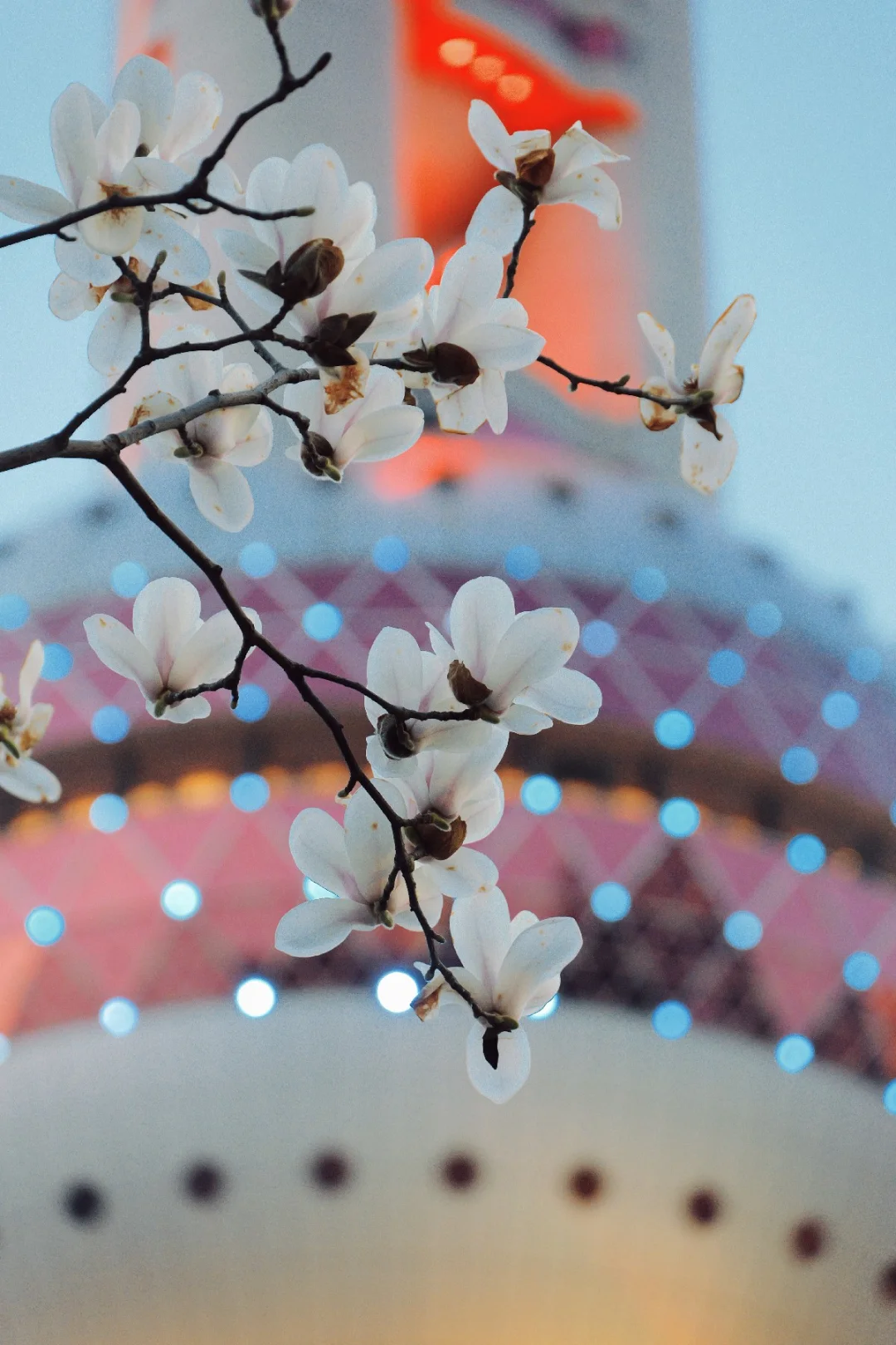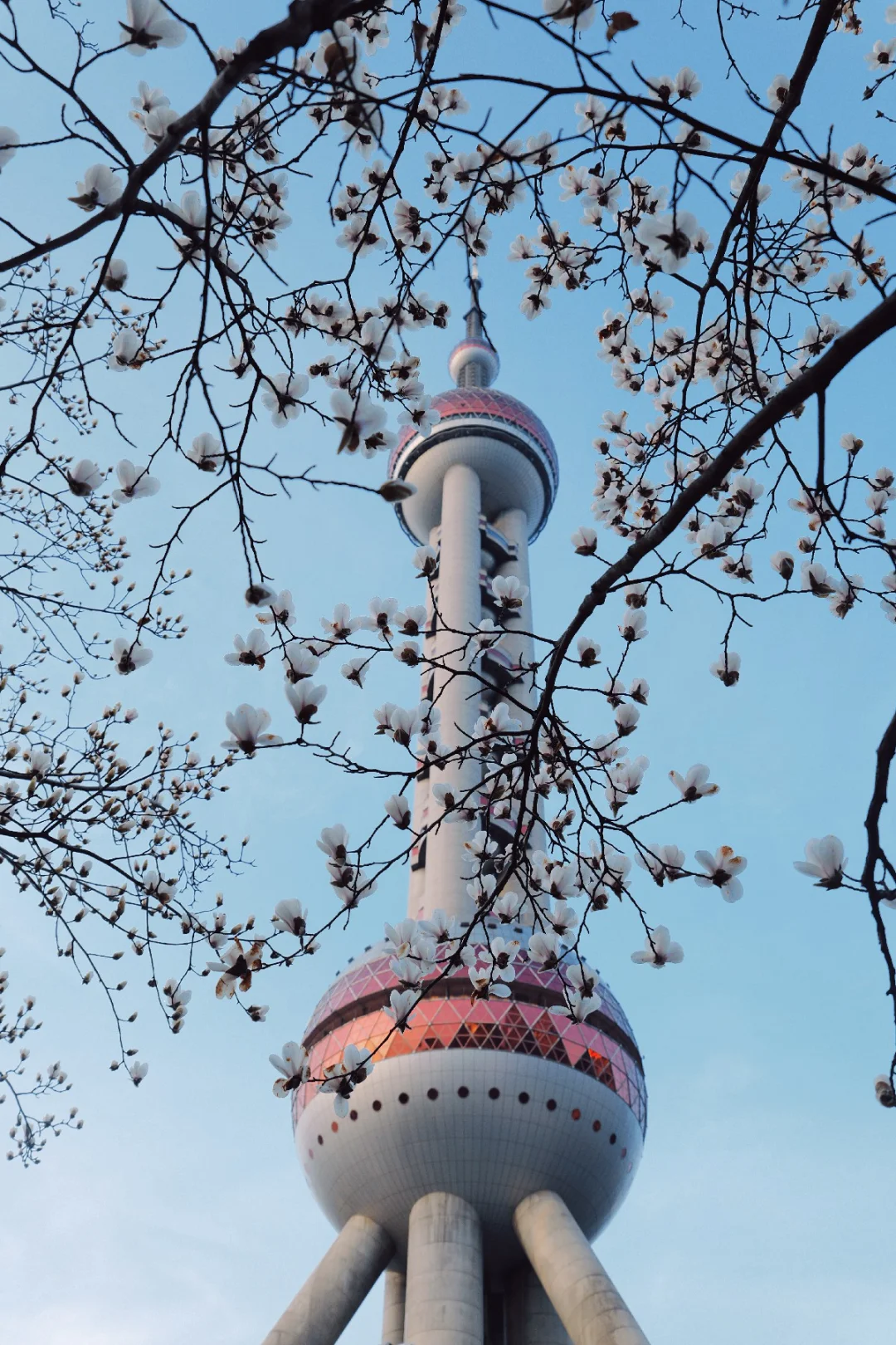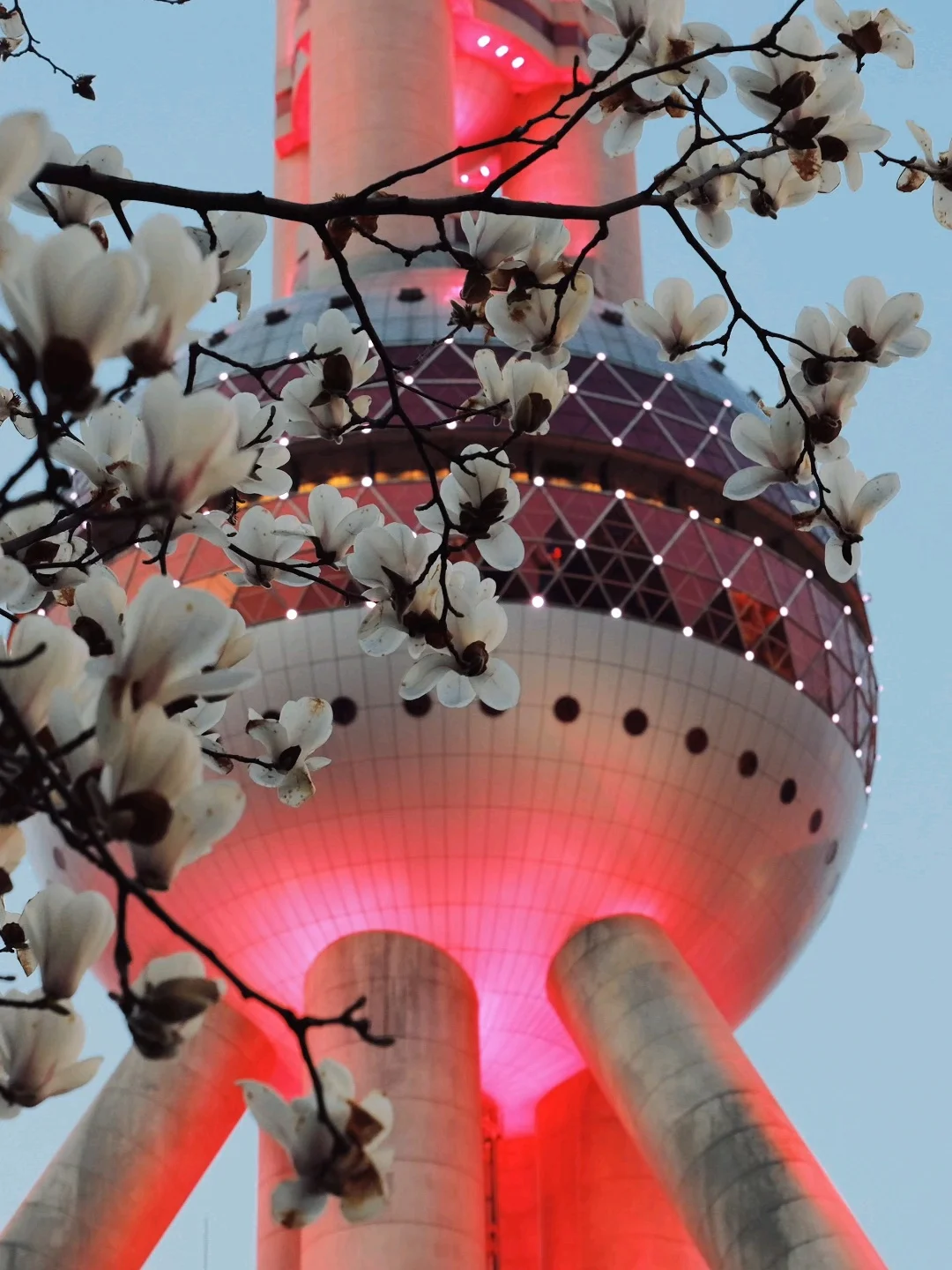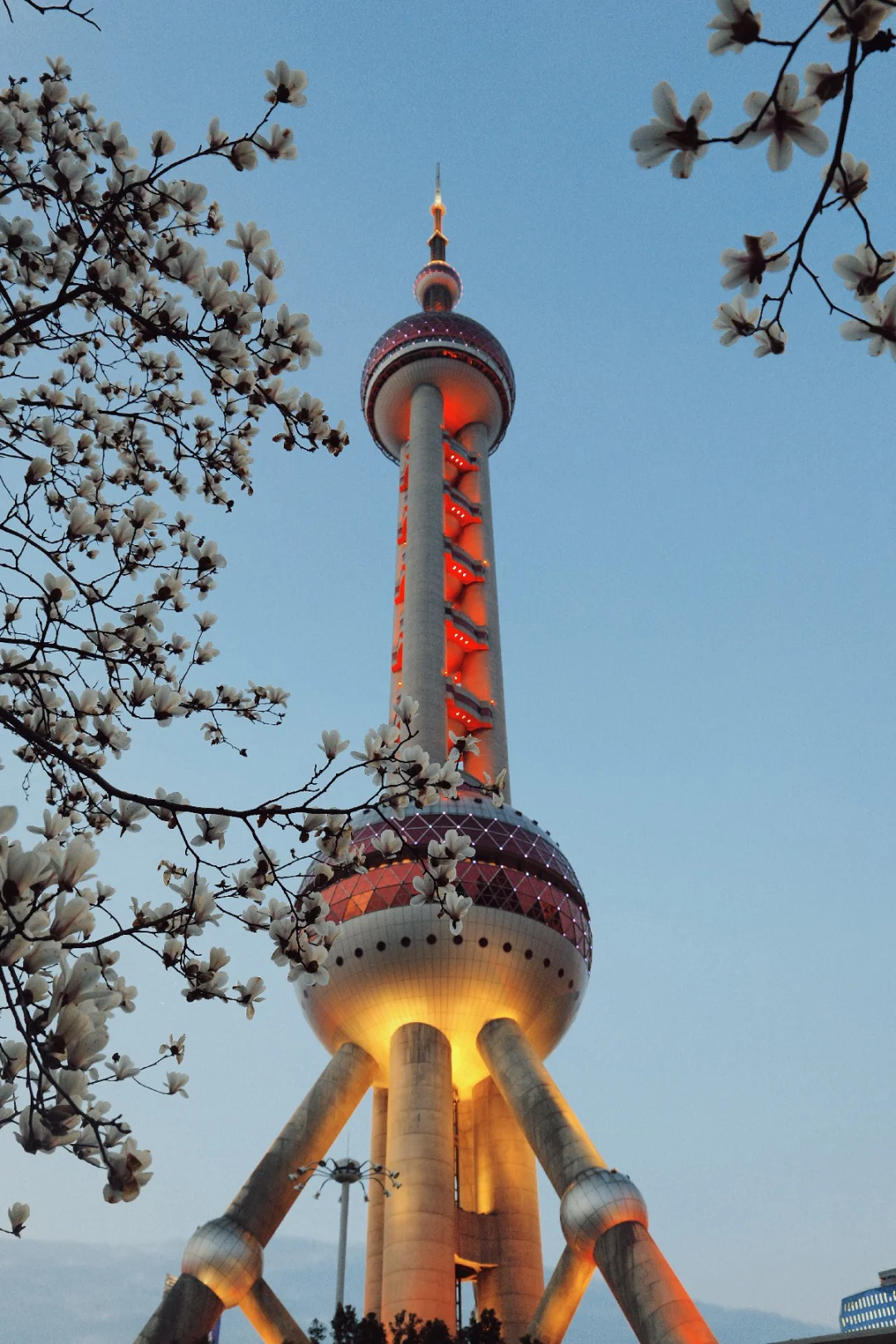 玉兰正好盛开,东方明珠灯光亮起的瞬间,美到失语。