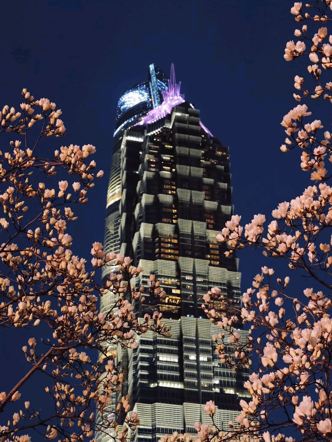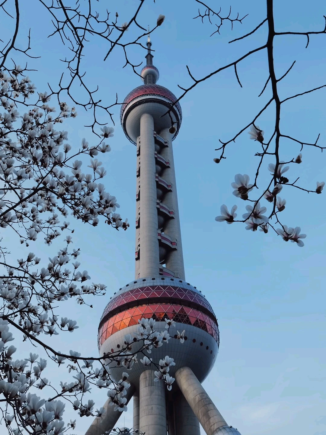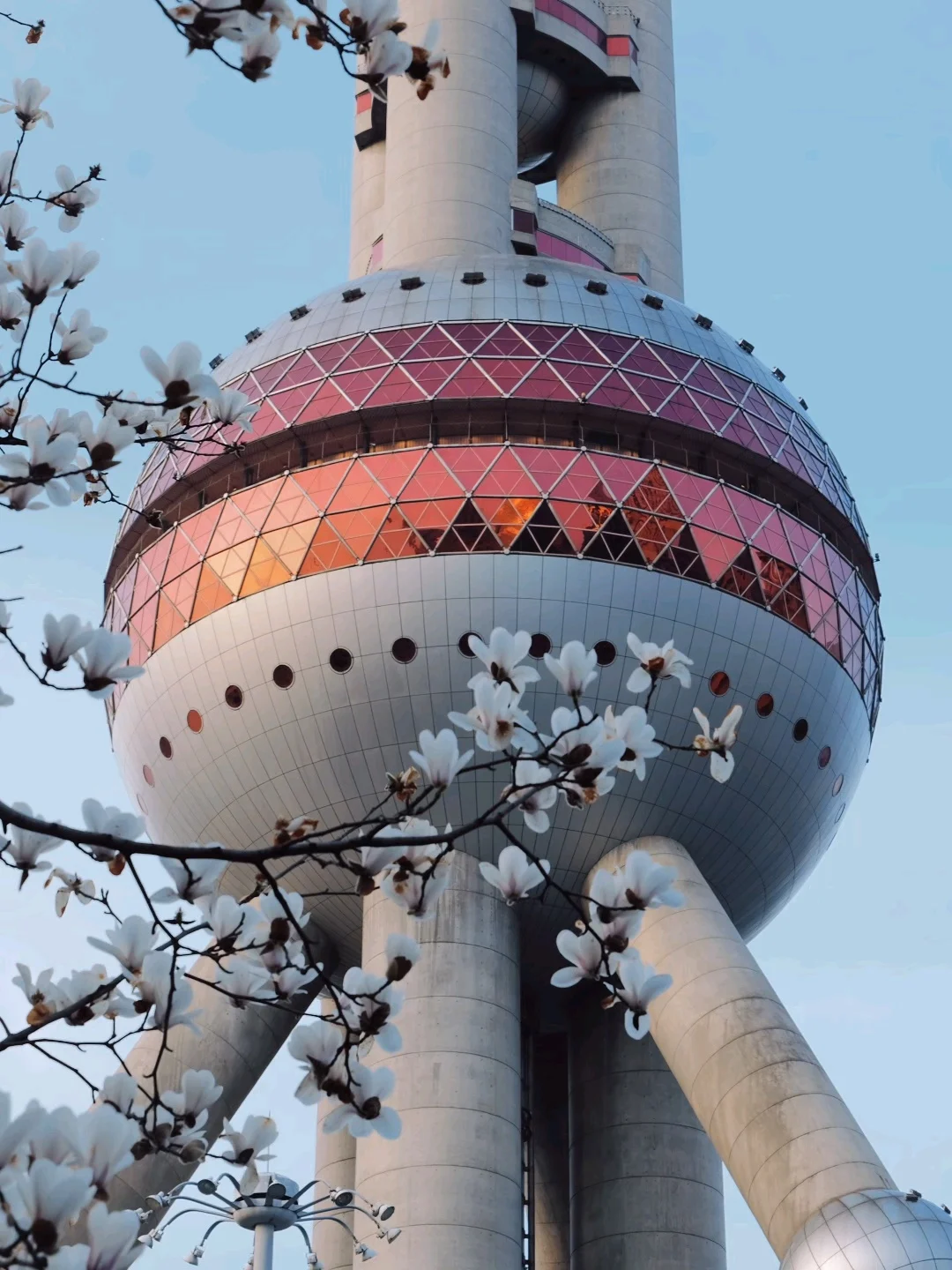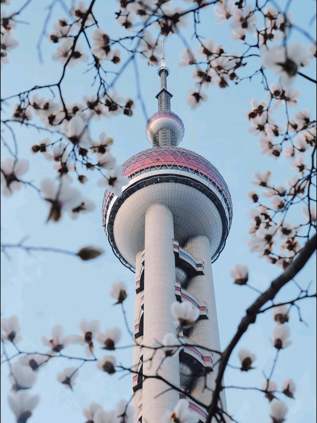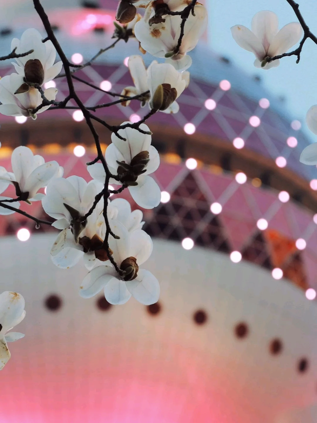 玉兰正好盛开,东方明珠灯光亮起的瞬间,美到失语。