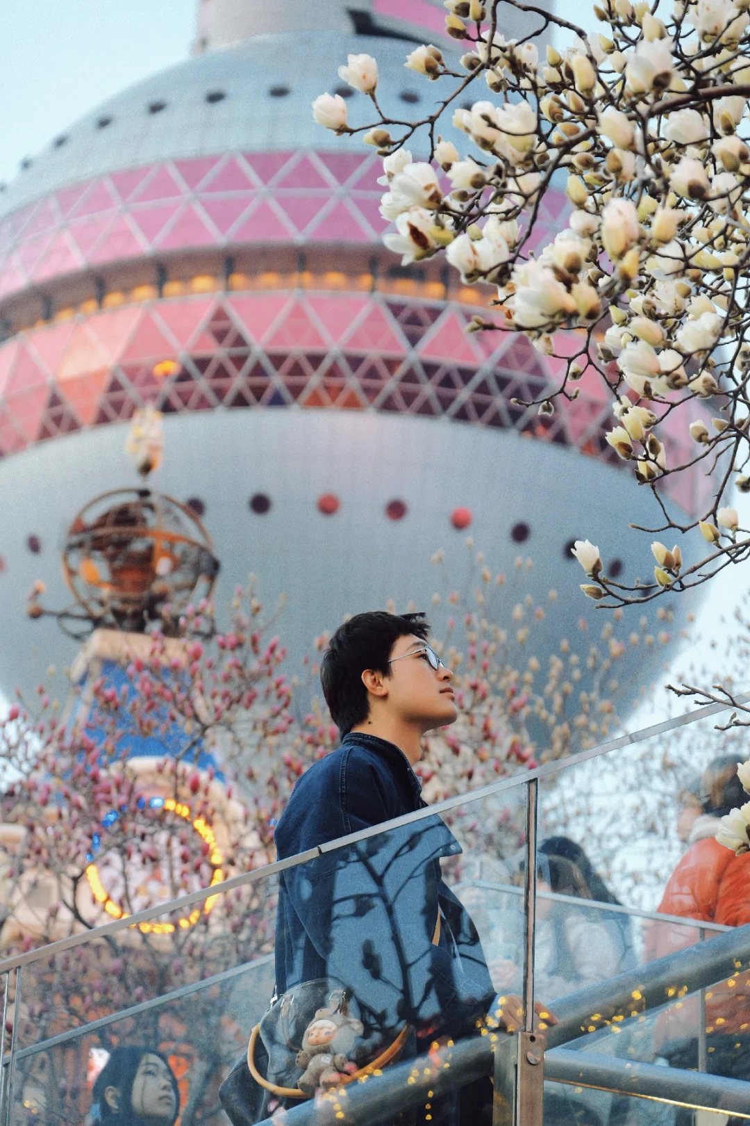 接着沿天桥步行400米到陆家嘴中心绿地,白玉兰+陆家嘴三件套同框,随便按快门都是高级感 。