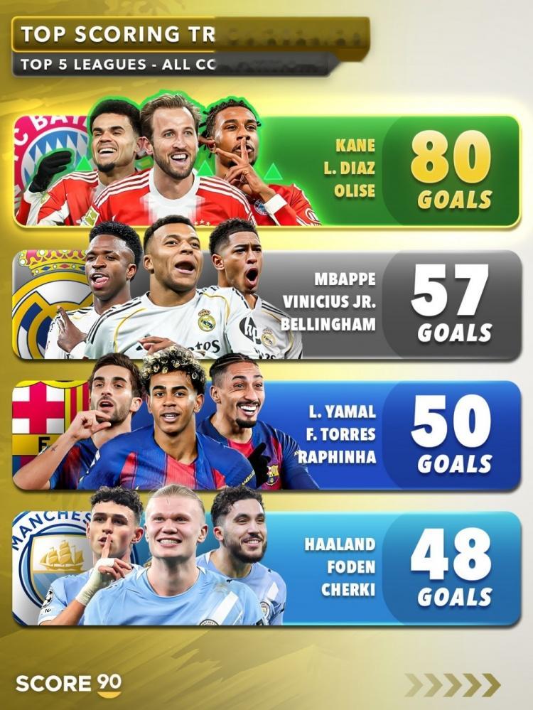 以下是目前欧洲五大联赛中,三叉戟总进球排名: