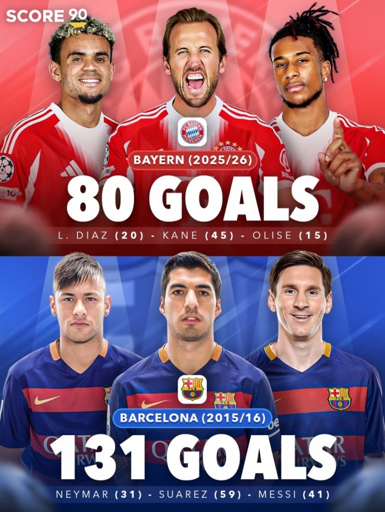 直播吧3月11日讯本赛季欧洲五大联赛的攻击线,风头最盛的莫过于拜仁凯恩、迪亚斯、奥利塞组成的三叉戟组合。据score90数据统计,拜仁三叉戟截止目前已经打进80球,距离当年在欧洲所向披靡的巴萨MSN组合最高单赛季纪录131球,还差51球。