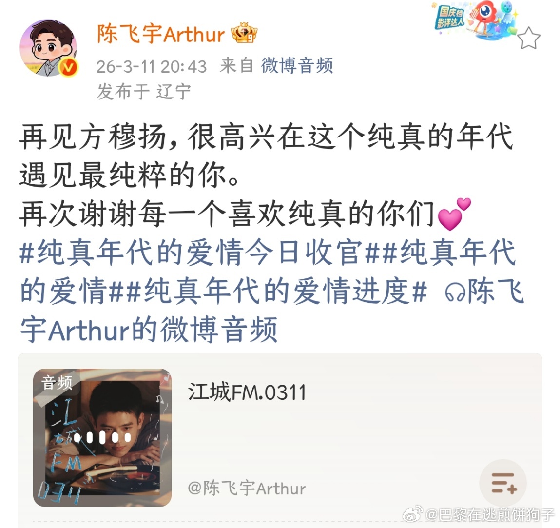 陈飞宇发电台告别方穆扬这个收官安排,让人对陈飞宇好感倍增。心思细腻,懂得感恩,用作品说话,也用真诚的态度面对观众,挺好的。 陈飞宇发文感谢观众