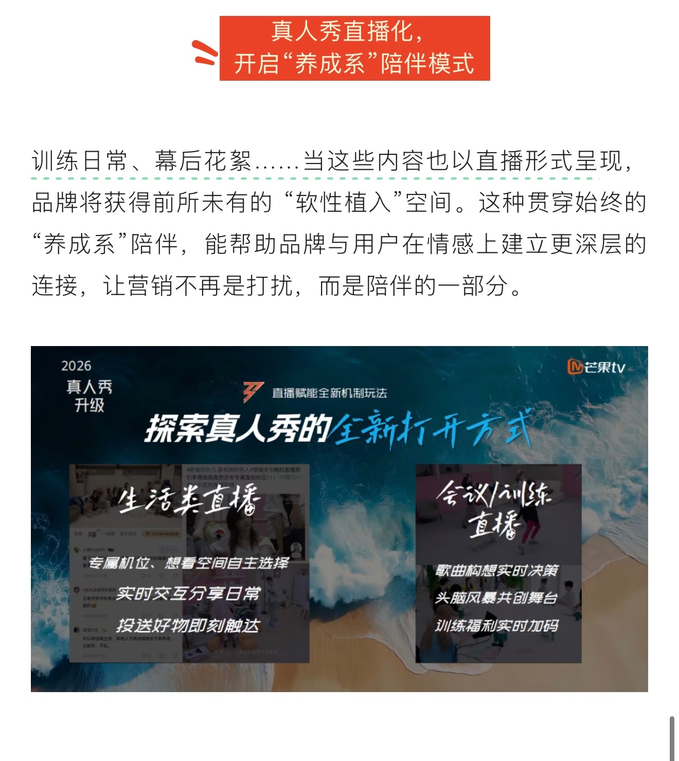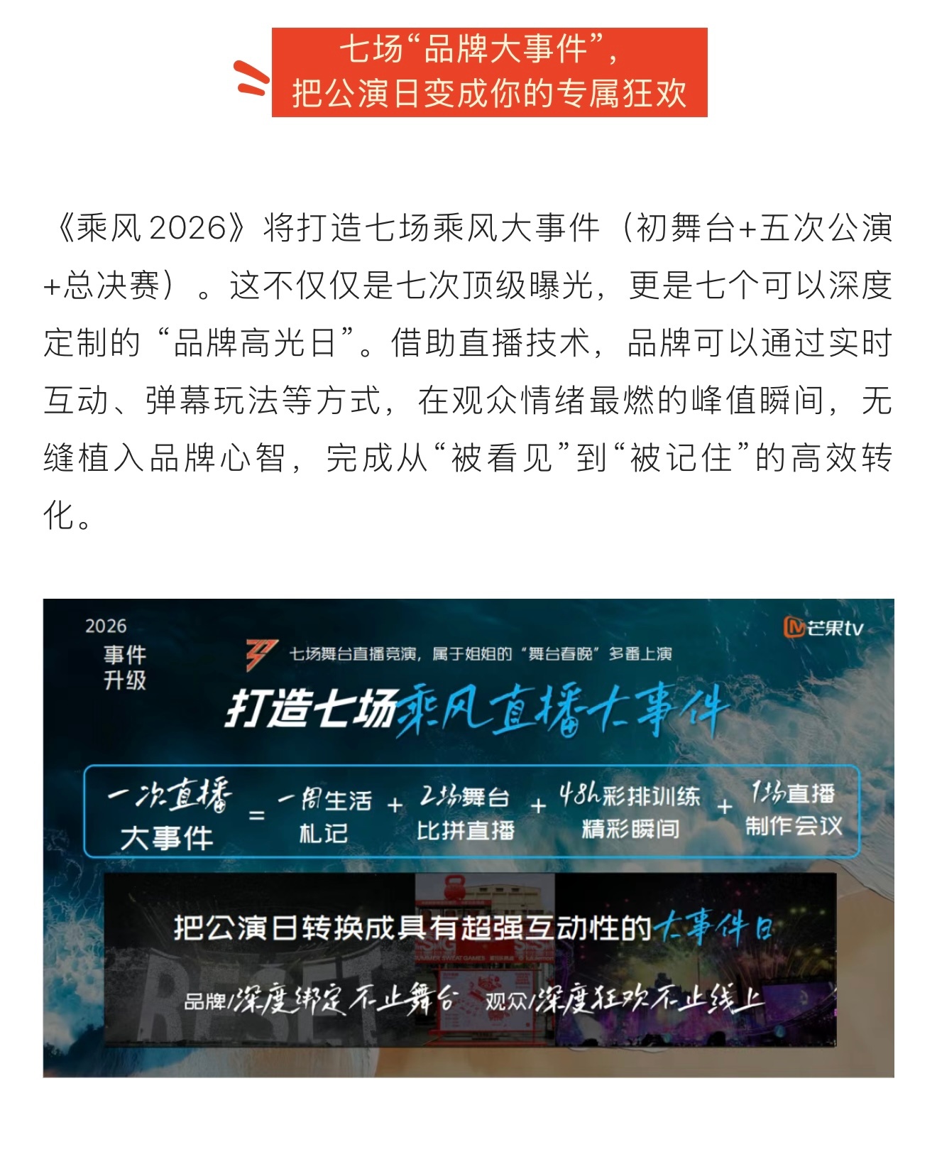 乘风2026将全程直播?玩真的呀?令人心动的不仅是阵容,节目也将迎来一次全新的升级——全舞台直播。这不仅是节目形态的改变,更是为品牌主打开了一扇通往“零时差、强互动、高转化” 全新营销场域的大门。直播这种即时互动带来的“真实感”与“不确定性”,是任何精心剪辑的录播都无法替代的。它让观众从“旁观者”变成了“参与者”,情绪被实时调动,话题被瞬间引爆。《乘风2026》将把这种“直播力”贯彻到底——从初舞台到总决赛,全程直播。