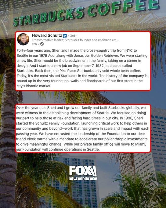 星巴克创始人霍华德·舒尔茨宣布,他将离开长期居住的西雅图,搬到佛罗里达州。与此同时,华盛顿州民主党人对企业主征收了一项全新的所得税。 这位亿万富翁咖啡大亨在太平洋西北地区生活了 44 年后,决定离开那里,前往税收优惠的阳光之州佛罗里达开启“新的冒险”。 舒尔茨加入了越来越多放弃蓝州(民主党占优势的州)而迁往佛罗里达等红州(共和党占优势的州)置业的商界领袖和富裕居民的行列。 根据霍华德·舒尔茨在领英上的帖子,他和妻子搬到了迈阿密“开启我们共同的下一个冒险”,理由是南佛罗里达阳光明媚,而且离他们在东海岸的孩子们很近。 就在华盛顿州通过一项针对年收入超过100万美元的9.9%的新所得税法案数小时后,舒尔茨宣布了这一消息。他并未提及税收问题,并希望华盛顿州继续保持对企业友好的环境,但他同时也将家族办公室迁至佛罗里达州。此举引发了人们对其避税动机的猜测。