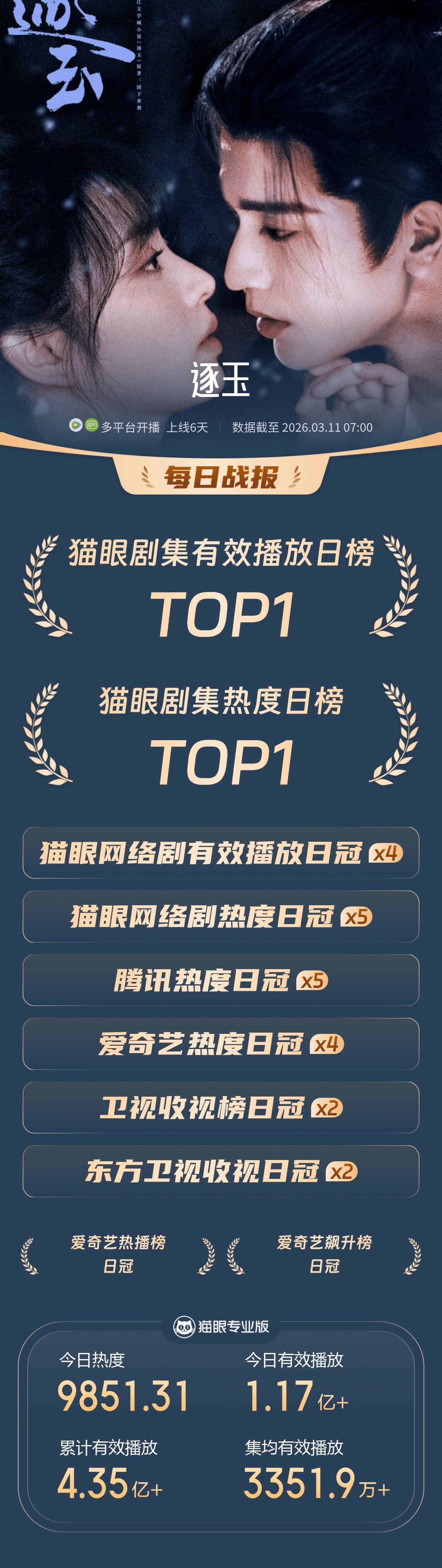 逐玉 我的评分:逐玉赢在了哪些方面 本来想随便看几集《逐玉》解解闷,结果直接一口气炫了八集,根本停不下来!这开年第一古偶真的赢麻了,方方面面都戳中人心!导演审美全程在线,雪中相遇的名场面每一帧都能当壁纸,街道的青石板路、挂着的腊肉竹筐,烟火质感直接拉满;男女主的感情也完全没有工业糖精,全是日常相处里慢慢滋生的真心,一不小心就会跟着剧情又哭又笑;阵容上还有刘琳、严屹宽这些老戏骨加持,全员演技在线,整部剧就没有拉垮的地方!还没追的小伙伴真的有福了,现在入股绝对不亏!逐玉