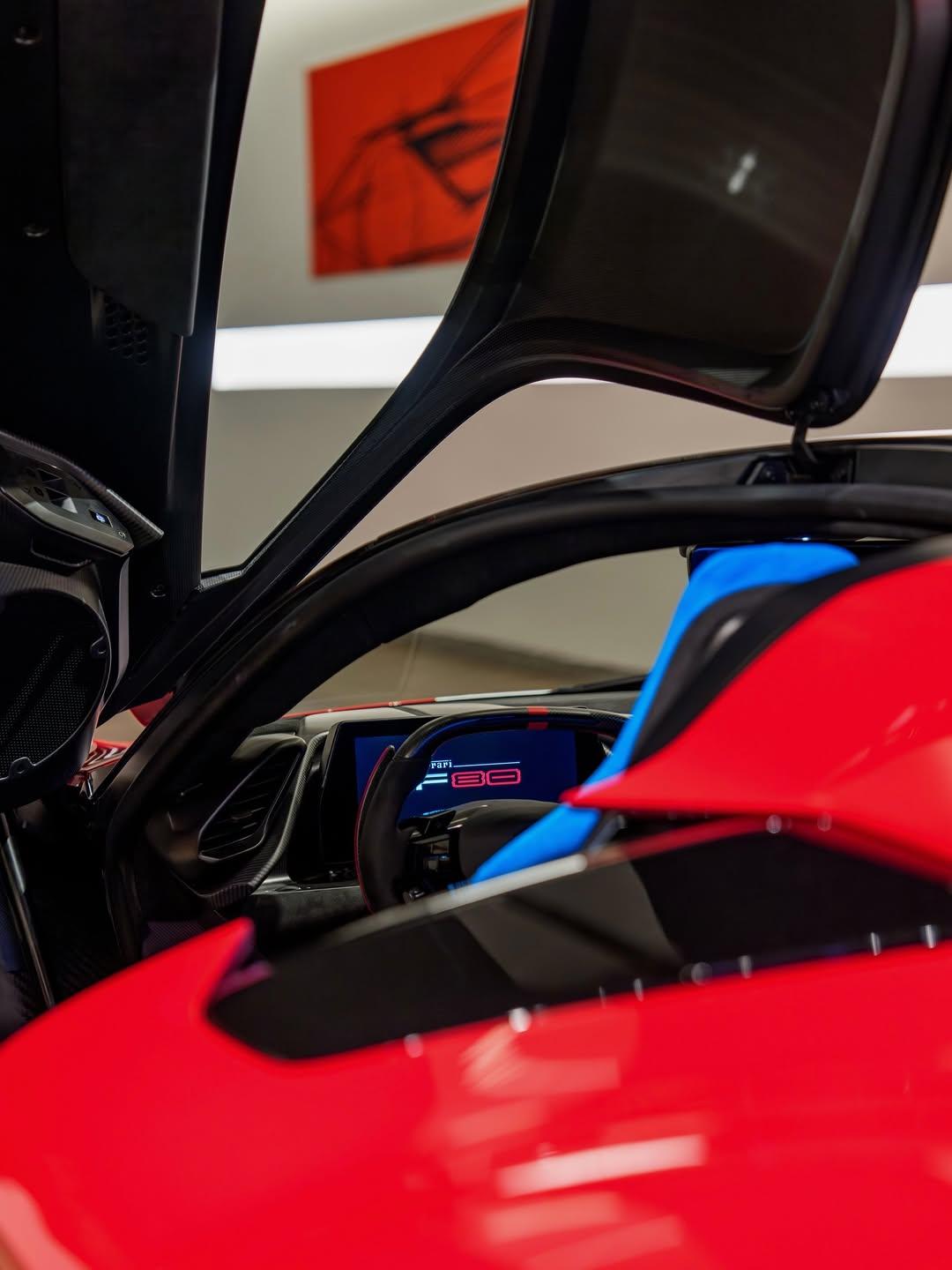 中国法拉利顶级VIP客户林志颖Ferrari F80 这台Ferrari F80由林志颖亲自选配,整车采用了带有银粉的四层红色Rosso TRS烤漆,向其幸运色致敬,尾翼则保留碳纤维原色,以及还选配了前20后21的碳纤维轮毂,进一步强化F80的运动氛围;白色与灰色的细节拉线,以及烤漆跃马盾牌徽章,让整体细节更加精致完整。座舱内部,他选择了蓝色的主驾驶座椅,并搭配黑色缝线与红色安全带,头枕上还刺有跃马徽章与F80字样。