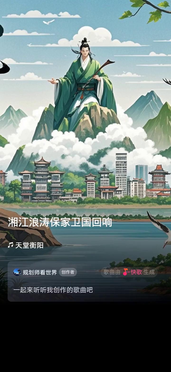 神仙乐逍遥,天堂衡阳。 规划师看世界创作者。 歌曲由快歌生成,一起来听听我创作的歌曲。 鸿雁显身手,衡阳。 祝融峰传神谕,仙嗓。 湘江浪传保卫战,惊叹。 小上海留亮光,大城市展风范。 神仙修炼汗水流淌,鸿雁传书往返翱翔。 祝融峰腾云驾雾迷茫,湘江浪涛保家卫国回响。 小上海史辉煌,大城市新风尚。 衡阳啊衡阳,心中最美的地方。 神仙逍遥鸿雁翱翔,处处春色芬芳。 衡阳啊衡阳,心中最恋的家乡。 祝融巍峨湘江荡漾,桩桩故事传扬。 大禹成功在衡阳,南岳显灵治洪荒。 永记史册历史犒赏,湘江载誉来再北上。 湘军操练成过往,石鼓咀故事发烫。 春风劲吹绿故乡,开天辟地变了样。 苏杭西湖许仙遇白娘娘,衡阳西湖酃湖袅袅茫茫。 石鼓咀鼓劲敲响,三江六岸焕新妆。 衡阳啊衡阳,心中最美的地方。 神仙逍遥鸿雁翱翔,处处春色芬芳。 衡阳啊衡阳,心中最恋的家乡。 祝融巍峨湘江荡漾,桩桩故事传扬。 快歌ID:193111163。更多精彩内容上快歌,用音乐表达生活。