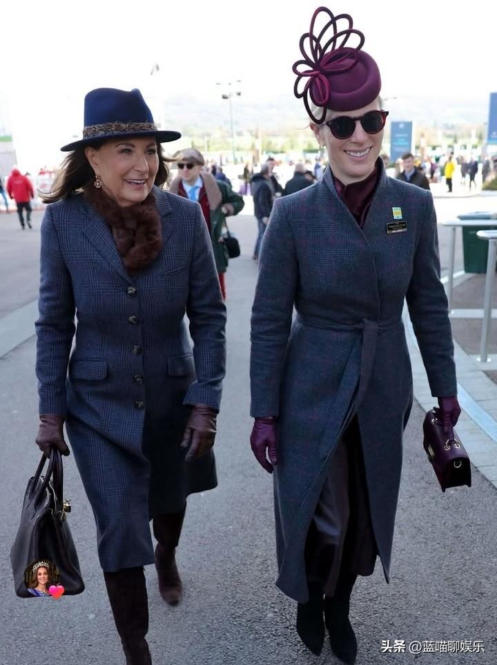 凯特王妃的妈妈卡罗尔·米德尔顿被拍到与卡米拉王后、安妮公主一起参加切尔滕纳姆赛马节“女士日”活动。 71岁的米德尔顿拿着一个爱马仕手袋搭配格纹大衣造型华贵,她和安妮公主的女儿扎拉有说有笑相处融洽。