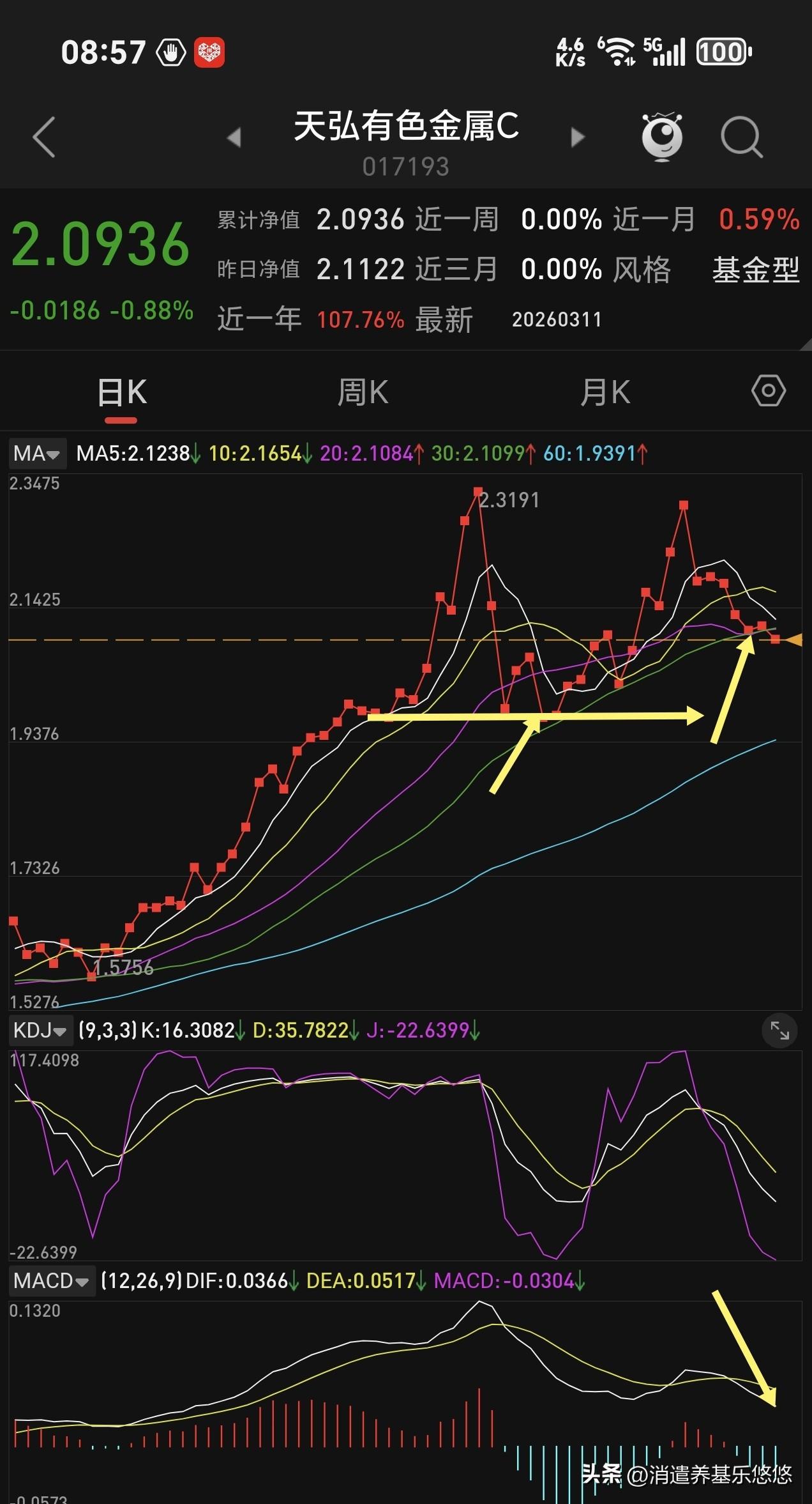 这个天弘工业金属怎么办?天天阴跌不止,拿的不耐烦了。下面是它的日线及周线走势图,周线昨天收盘险守5周线支撑,岌岌可危。日线5日线死叉10日线,并且已经跌破了30日线支撑,macd绿柱还在加长,短线回调没有到位,看今天能不能收回去30日线支撑,否则要回踩下方前低支撑位,跌幅有点大啊。我想再忍忍,不行就转走!哪里去?现在哪里都不保险。