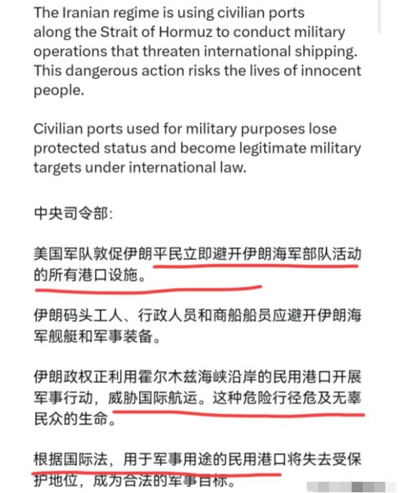 美国准备下狠手了,美国发出最后通牒!3月11日,美国中央司令部警告称,美国军队敦促伊朗平民立即避开伊朗海军正在运作的所有港口设施,伊朗码头工人、行政人员和商业船只船员应避免使用伊朗海军舰艇和军事装备。伊朗政权正在利用霍尔木兹海峡沿岸的民用港口进行威胁国际航运的军事行动。这一危险行动危及无辜人民的生命。 根据国际法,用于军事目的的民用港口失去了受保护的地位,将成为合法军事目标。很显然,美军的这一通告,就是对伊朗发出了最后通牒。 美国此举目的何在呢? 说白了,就是要伊朗进行二选一。 要么伊朗立刻停止利用民用港口开展军事活动,放弃对霍尔木兹海峡的强势管控,乖乖听从美国的摆布;要么就硬扛到底,接受美军可能对这些港口发动的军事打击,彻底撕破脸正面抗衡。 核心原因就一个——霍尔木兹海峡,这个被称为全球能源“咽喉”的地方,几乎攥着美国和全球能源市场的命门。 这里每天运输的原油占全球海运石油贸易的31%到34%,液化天然气(LNG)占全球发货量的20%左右,还有近30%的液化石油气(LPG)也从这里经过。 经过这里的原油,80%以上都运往中国、印度、日本、韩国等亚太国家,就连美国自己,每天也有大约50万桶原油要从这里运输。 可以说,只要霍尔木兹海峡出一点问题,全球油价都会立刻暴涨,各国的能源供应都会受到冲击,这也是美国最在意的一点。 而伊朗,恰恰掌握着霍尔木兹海峡的控制权。近期美以和伊朗的军事对峙已经进入第十一天,冲突已经造成超过1.5万名伊朗公民受伤,双方你来我往打得不可开交。 美军宣称摧毁了伊朗90%以上的导弹发射器,还击沉了数十艘伊朗海军舰艇,而伊朗也不甘示弱,启动了多轮打击行动,发射多种型号导弹,甚至击落了大量美军无人机,誓言要“以眼还眼”反击美以的侵略。 在这种僵持局面下,美国发出最后通牒,本质上就是想通过施压伊朗的港口,削弱其对霍尔木兹海峡的管控能力,打破当前的对峙僵局。 有人可能会觉得,美国拿“民用港口用于军事目的”当借口,是不是有点小题大做?其实不然,美国这是在为自己的军事行动找“合法外衣”。根据1949年日内瓦公约相关规定,民用港口如果被用于军事目的,确实会失去受保护的地位,成为合法的军事目标。 美国就是抓住这一点,提前警告伊朗平民远离港口,既可以减少后续军事打击可能带来的平民伤亡,避免国际社会的指责,又能名正言顺地将伊朗的港口列为打击目标,可谓是“一举两得”。 面对美国的最后通牒,伊朗的态度也十分强硬。就在美军发出警告的当天,伊朗武装部队发言人就明确表示,如果伊朗的港口和码头遭到威胁,本地区所有港口和码头都会成为伊朗的“合法目标”。 不仅如此,伊朗伊斯兰革命卫队还宣布,霍尔木兹海峡处于其严密管控之下,美国及其盟友的船只无权通行,甚至放话“如果存有怀疑,可以靠近试试”,态度丝毫没有妥协的余地。 与此同时,伊朗方面还明确拒绝了特朗普提出的“有条件谈判”,表示与美国的谈判根本不在伊方的议程上,坚定地要和美国硬刚到底。 其实美国此举,还有一个隐藏的目的,就是缓解国内的压力。随着美伊对峙的持续,美国国内的油价已经大幅飙升,加州州长多次抨击政府对伊动武,导致民众承受高昂的油价成本,国内反战声浪也越来越高。 而且美国政府内部对于这场冲突的态度也不统一,两党分歧扩大,就连共和党内部也有不同意见,特朗普政府已经有点“撑不住”了。 所以,美国发出最后通牒,也是想尽快迫使伊朗妥协,早日从这场冲突中脱身,避免国内矛盾进一步升级。 目前来看,美伊双方的矛盾已经到了临界点,最后通牒的发出,意味着霍尔木兹海峡的局势将进一步升级。一边是美国的强势施压,甚至已经在秘密起草停火方案,但本质上还是不平等的霸王条款;一边是伊朗的坚决反击,手握霍尔木兹海峡这张“王牌”,绝不低头妥协。 这场博弈,不仅关乎美伊两国的利益,更牵动着全球能源市场的神经,一旦局势失控,全球油价可能会再次暴涨,甚至影响到每个普通人的生活。 不过大家也不用过度担心,虽然双方剑拔弩张,但都清楚一旦彻底撕破脸,后果不堪设想。美国需要霍尔木兹海峡的能源通道保持畅通,而伊朗也需要通过海峡的航运维持自身经济,双方都有一定的克制空间。 后续局势如何发展,还要看双方的进一步动作,但可以肯定的是,霍尔木兹海峡的博弈,还会持续一段时间。