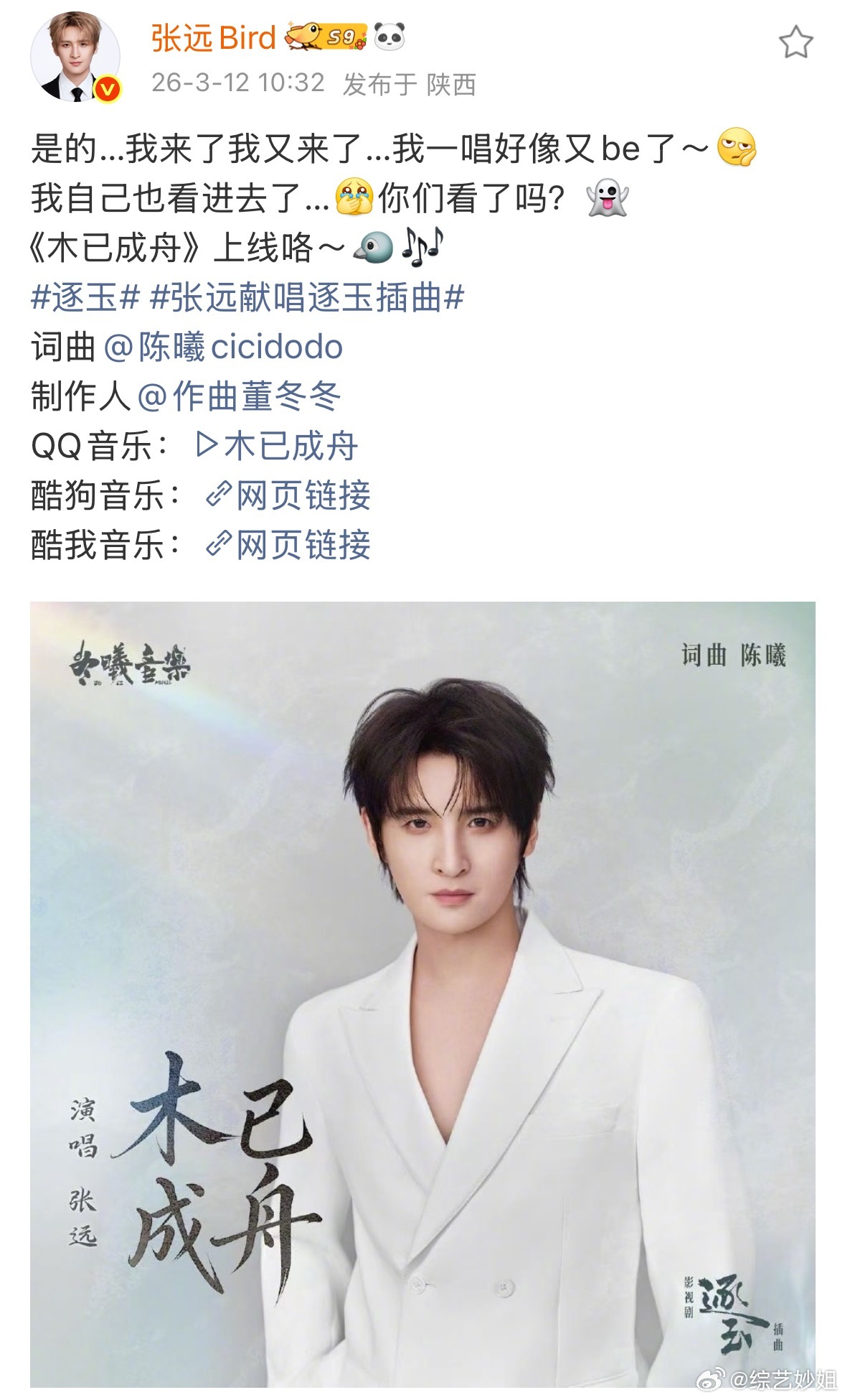 张远唱了《逐玉》ost,一开口好像又be了《逐玉》他自己也看进去了,还问大家看了吗?张远问看逐玉了吗张远一唱好像又be了