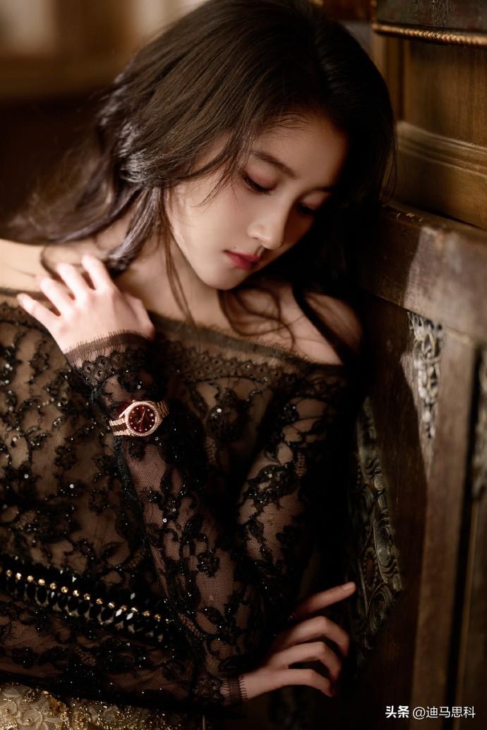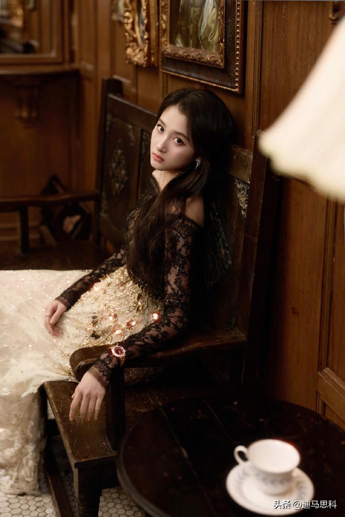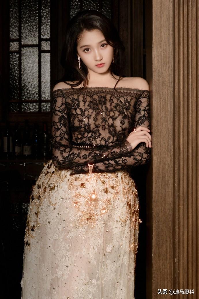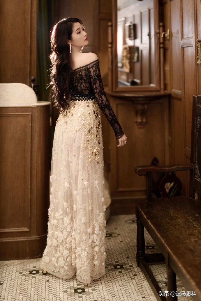 关晓彤写真,黑色蕾丝上衣是透视款,一字肩的设计恰到好处地露出精致锁骨和肩部线条,既带着点小性感,又不失优雅,把她的成熟气质狠狠提升了一把。白色长纱裙又为整体增添了几分清新甜美,就像从童话里走出来的公主。钻石的点缀更是画龙点睛,让她整个人闪闪发光,可甜可御说的就是她,这谁能不爱啊! 关晓彤礼裙造型