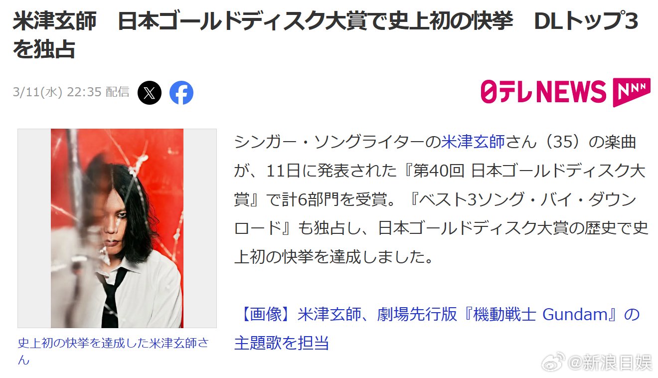 米津玄师米津玄师在流媒体部门凭借《IRIS OUT》夺得 “年度流媒体歌曲(邦乐)”以及“最佳流媒体歌曲TOP5”。在下载部门,他为高达系列最新作《机动战士高达 GQuuuuuuX》创作的主题曲《Plazma》,荣获最高奖项“年度下载歌曲(邦乐)”。在“最佳下载歌曲TOP3”——即统计期间内付费下载量最高的前三名作品中,米津玄师的《IRIS OUT》《Plazma》和《BOW AND ARROW》全部上榜。