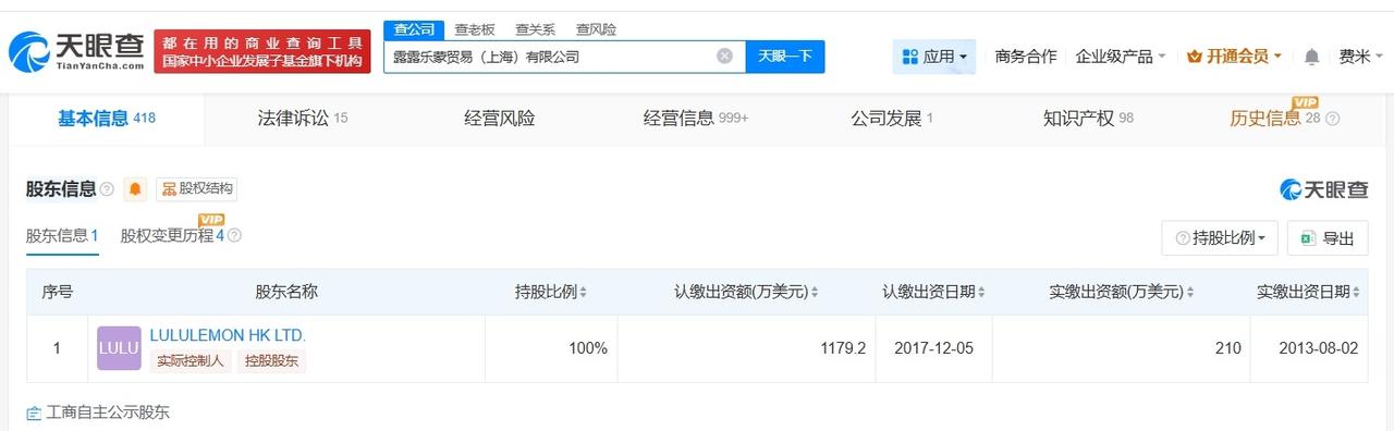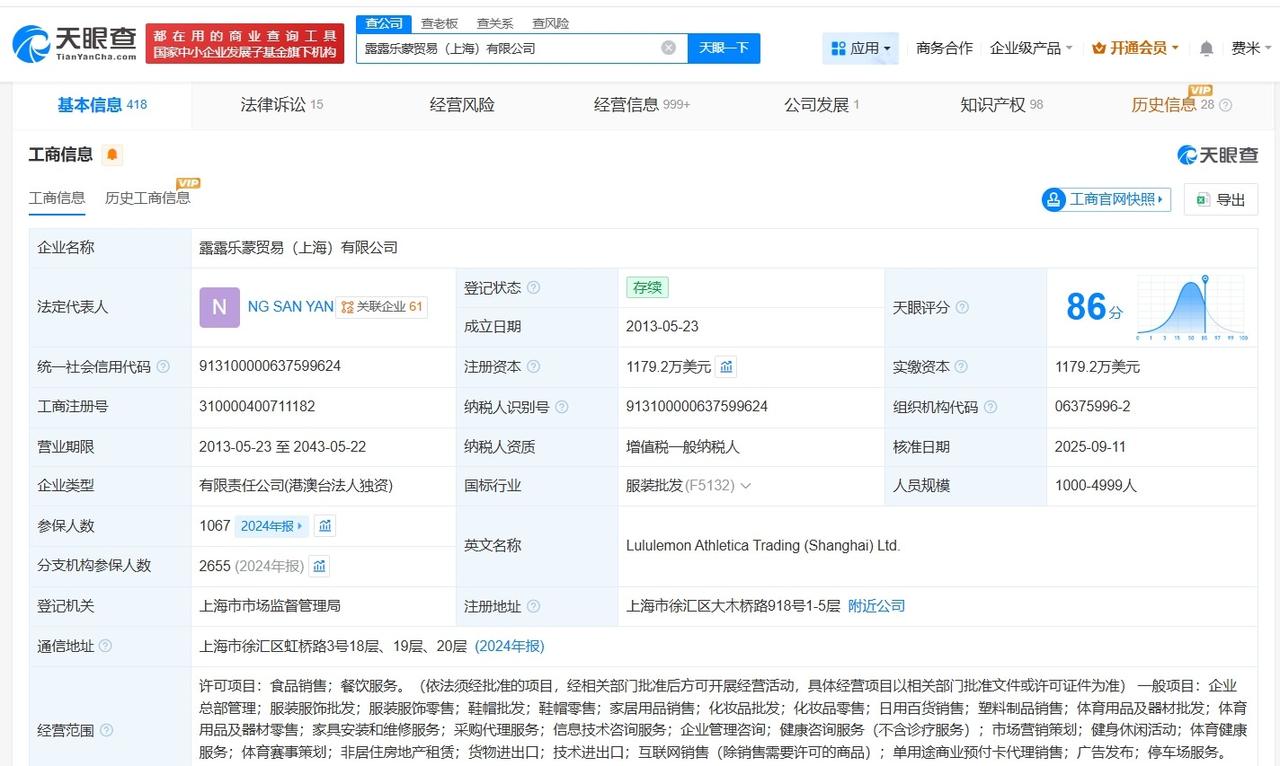 Lululemon中国商业版图盘点 Lululemon中国现有超百家分支机构80元Lululemon发圈卖断货 据媒体报道,近日,一款80元的Lululemon的发圈卖断货,其在社交媒体引发热议。 天眼查App显示,Lululemon中国关联公司露露乐蒙贸易(上海)有限公司成立于2013年5月,法定代表人为NG SAN YAN,注册资本1179.2万美元,经营范围包括食品销售、餐饮服务、企业总部管理等。股东信息显示,该公司由LULULEMON HK LTD.全资持股。分支机构信息显示,该公司拥有超160家分支机构。 天眼查信息: