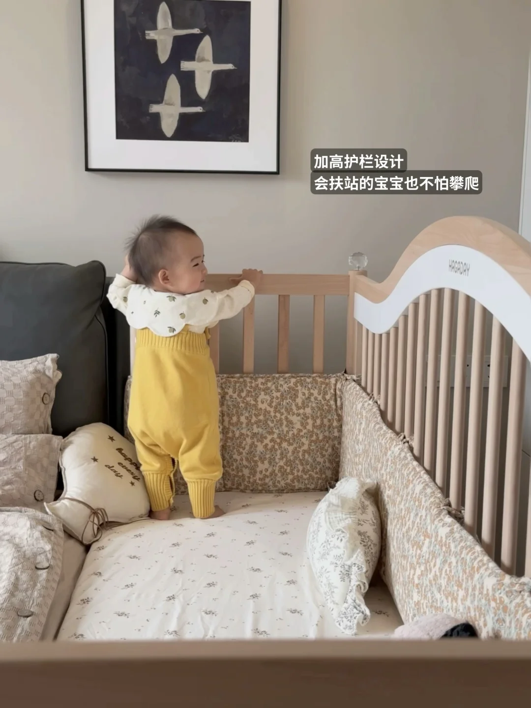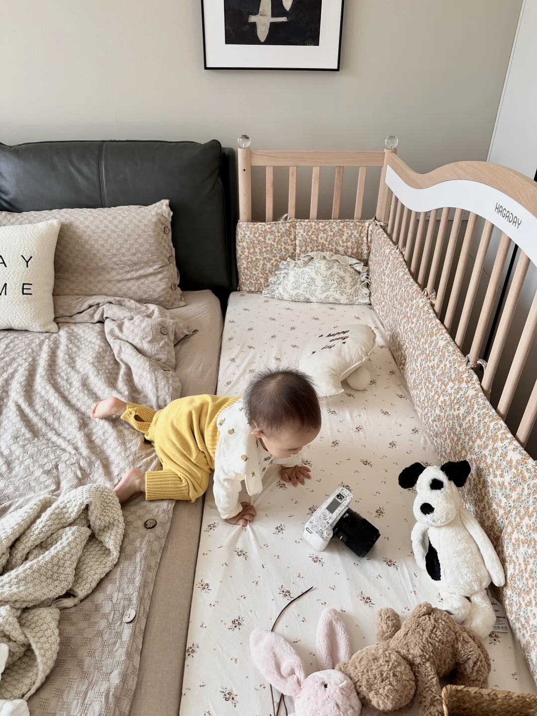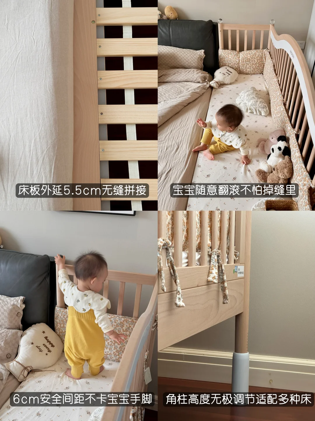 米宝转眼就要进入11月龄 大运动明显进步后, 半夜睡觉有时竟然会突然坐起来! 摇摇晃晃自己继续找枕头睡着的样子着实可爱~ 但老母亲还是担心原本小床的围栏不够高 扶站着栽下床就麻烦了~ 哪怕小户型果断换了拼接床, 实现大通铺真的太爽了!! 200*60的尺寸我家小户型也放得下, 宝宝睡觉可以随意翻滚, 白天可以是安全的玩耍区域。 这款床板外延5.5cm, 高度可以通过旋转任意调节 真正和大床无缝拼接, 61cm加高护栏和6cm的安全间距, 真正守护宝宝安全 宝宝睡得好同时麻麻也能睡得安心~