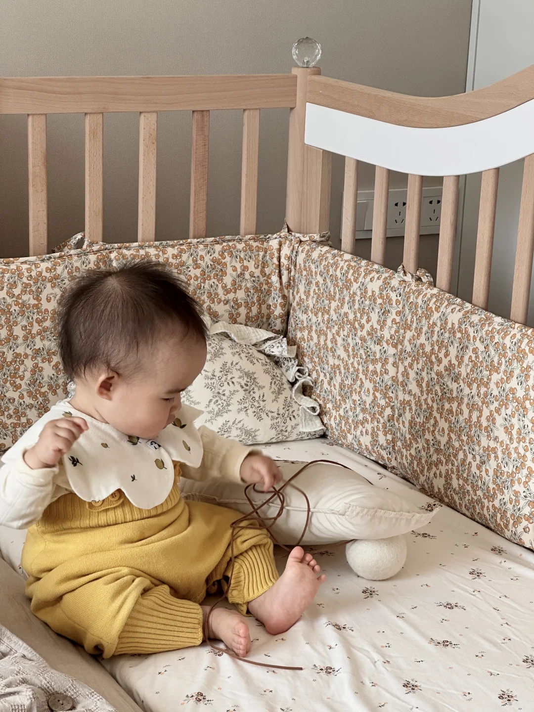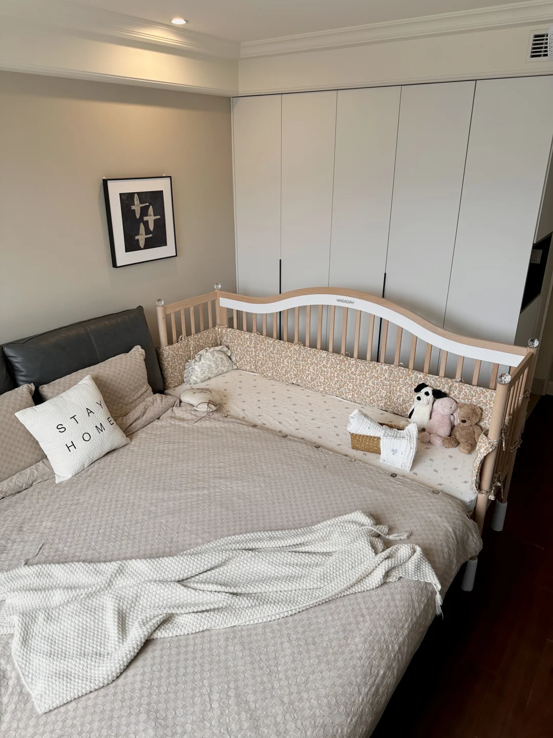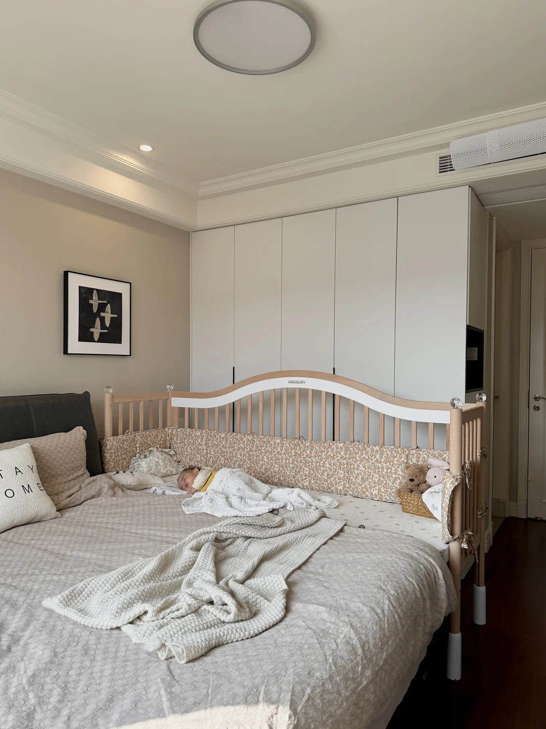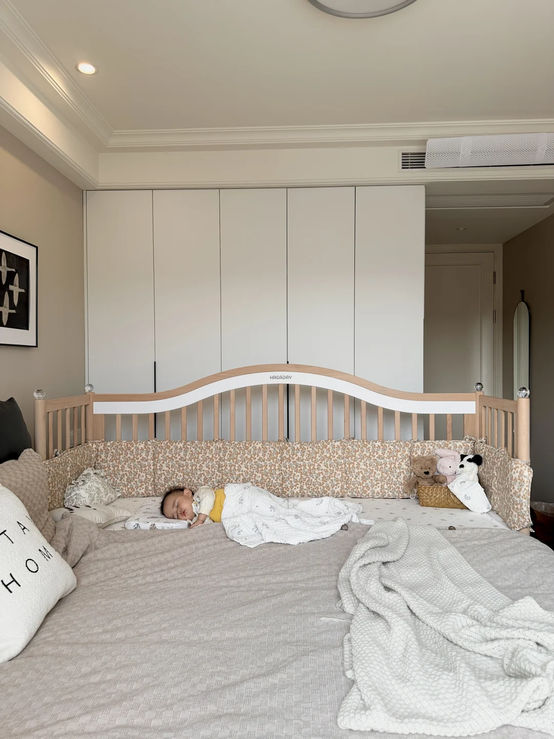 米宝转眼就要进入11月龄 大运动明显进步后, 半夜睡觉有时竟然会突然坐起来! 摇摇晃晃自己继续找枕头睡着的样子着实可爱~ 但老母亲还是担心原本小床的围栏不够高 扶站着栽下床就麻烦了~ 哪怕小户型果断换了拼接床, 实现大通铺真的太爽了!! 200*60的尺寸我家小户型也放得下, 宝宝睡觉可以随意翻滚, 白天可以是安全的玩耍区域。 这款床板外延5.5cm, 高度可以通过旋转任意调节 真正和大床无缝拼接, 61cm加高护栏和6cm的安全间距, 真正守护宝宝安全 宝宝睡得好同时麻麻也能睡得安心~