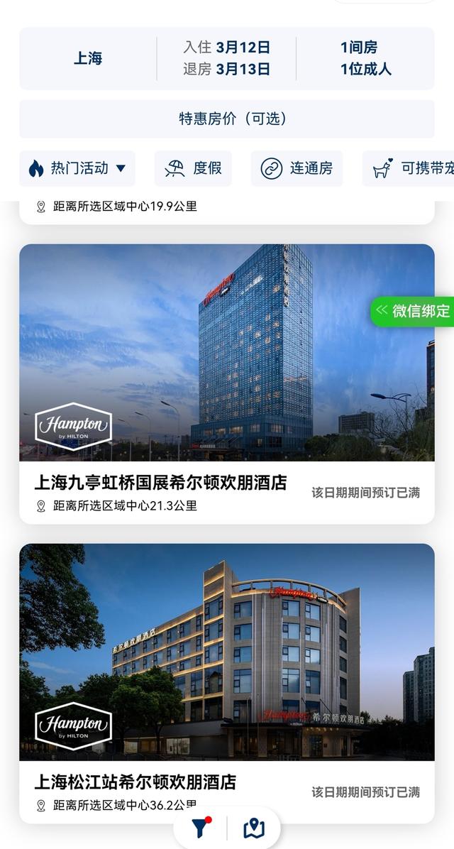 希尔顿集团旗下多家酒店显示满房。均手机截屏