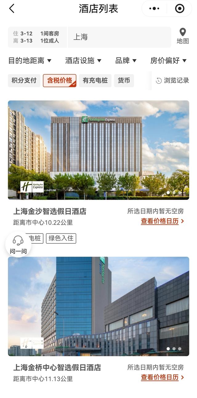 在洲际酒店集团“优悦会”小程序上,记者以3月12日入住、3月13日退房为例查询,发现该集团旗下上海区域超过40家酒店显示满房状态。