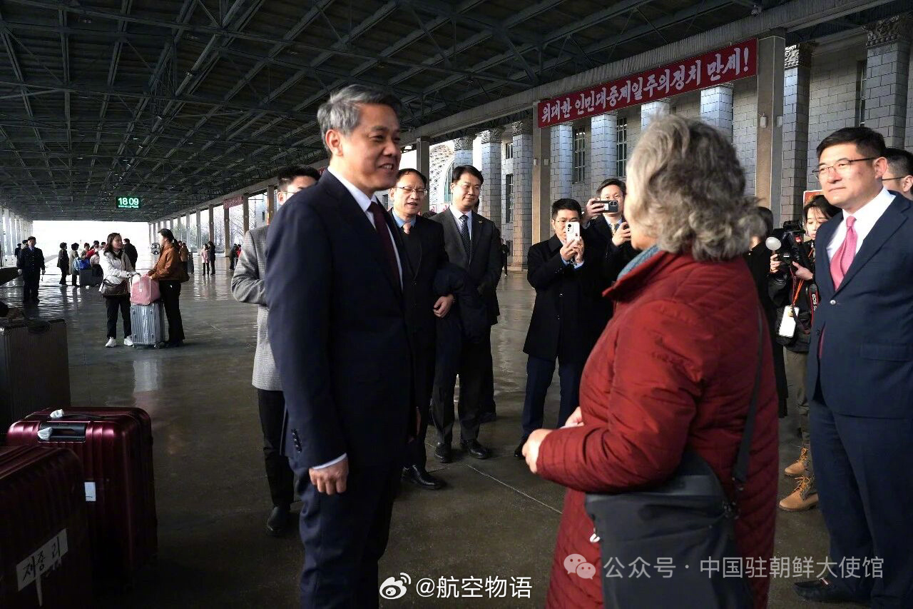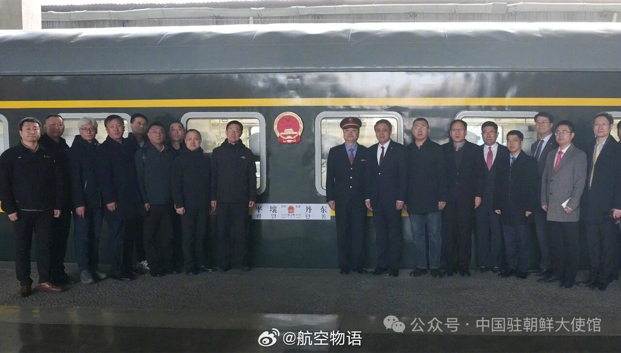 【恢复开行后首趟中朝国际列车抵达平壤,中国机车牵引】根据中国驻朝鲜大使馆发布的消息,今天傍晚,复开后首趟中朝国际列车丹东—平壤95次国际旅客列车准时驶进平壤站,标志着中朝国际旅客列车时隔6年顺利恢复开行。王亚军大使率中国驻朝鲜使馆部分外交官,朝鲜铁道省对外事业局局长金勇浩等在站台迎接首批乘客。
