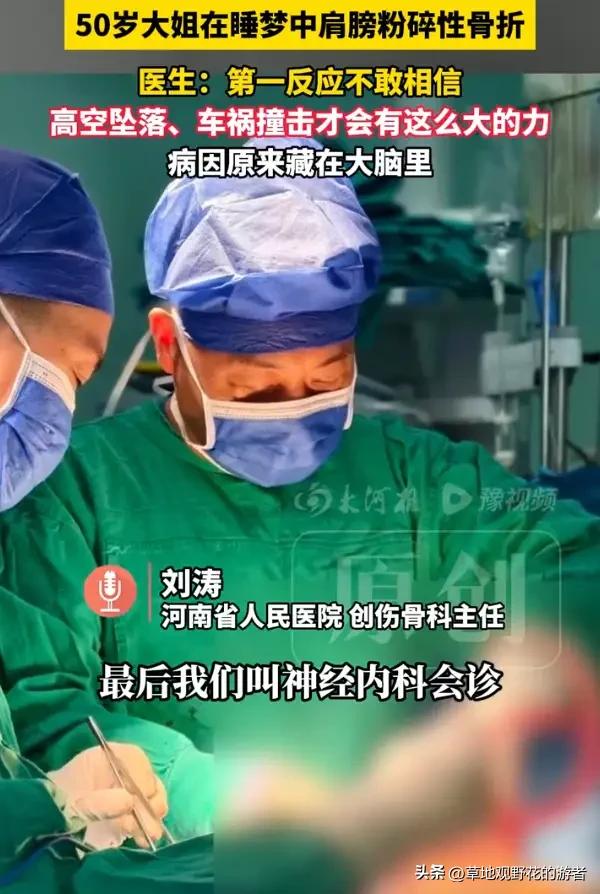 这下解释不清了!河南,一位50岁大姐肩膀粉碎性骨折,来到医院后,医生还以为是被车撞了,可家人告知大姐是在睡梦中骨折的,不仅家人觉得惊讶,就连医生第一反应都是不相信 就在今年初的河南,一起发生在深夜里的离奇急诊,直接震碎了不少骨科医生的常识。 当那位50岁的张大姐被家属抬进急诊室时,整条右胳膊呈现出一种极其诡异的瘫软状态。那种疼是钻心的,大姐脸上的汗珠子劈里啪啦往下掉。医生接过刚洗出来的影像片子,手都不自觉地抖了一下。片子里的右肱骨头碎得一塌糊涂,断裂的骨渣甚至直接刺进了关节。这种破坏力让主治医生下意识地转过头,死死盯着陪同的家属,语气里满是质疑:“这伤口,你们确定不是在高速上被车撞了?” 在骨科的医学评级里,这种损伤叫作Neer4型骨折,属于塔尖上的重症。通常只有高空坠落或者极其猛烈的车祸撞击,才能制造出这种效果。家属赌咒发誓,大姐这大半辈子连车都没刮蹭过,更别提坠楼了。 就在几个小时前的凌晨三点,丈夫被一声沉闷的响动惊醒。扭头一看,枕边的妻子不仅四肢僵直,嘴里还发出模糊的哼声,人就像突然被冻住了一样。待大姐全然苏醒之际,她的右肩已然损毁。没下床,没摔跤,甚至连个剧烈的翻身动作都没有。谁能相信,安稳睡个觉能把骨头睡成碎末? 此事于医院之中迅速传开。上至医护人员,下至病患家属,皆有所耳闻,传播之速令人咋舌。刚开始,大家都顺着常规逻辑去猜,是不是大姐平日里缺钙太厉害,骨头已经脆成了风化的酥饼?毕竟对于50岁左右的女性来说,激素水平波动和钙流失是常态。如果骨质疏松到了极点,稍微翻个身导致骨折,逻辑上似乎也能自圆其说。 随后的骨密度检测和肿瘤筛查直接把这个猜测扇回了肚子里。各项数据指标显示,大姐的骨骼密度非常健康,完全不存在病理性脆裂的可能。排除了外力撞击,也排除了骨头本身脆弱,那股能把坚硬肱骨强行拽碎的恐怖能量,究竟是从身体的哪个角落里钻出来的? 谜底直到神经内科专家介入才被彻底揭开。医生细心地捕捉到了一个被全家人忽视多年的细节:大姐平日里经常会毫无征兆地愣神几秒。那种类似“白日梦”的瞬间,以前都被当作是带孙子太累、干活太辛苦。谁也没往脑部病变上想,总觉得缓过那一阵子,人就又是好好的了。 直到那份脑电图结果在打印机里吱吱作响,所有人才看清真相,那是典型的癫痫波。原来,大姐的大脑运动中枢,一直潜伏着一颗未爆弹。那一晚的真相其实比车祸更惊心动魄。在沉睡中,大姐的大脑突然经历了一场极端的“电荷风暴”。异常放电瞬间引爆了她上肢的肌肉群。 在那几秒钟里,大姐的右臂肌肉像一只发疯的绞肉机,产生的极端拉力硬生生将肱骨头拽得粉碎,甚至把肩胛骨的关节盂撞出了一个深坑。这才是真正的“内伤”。没有轰鸣的引擎,没有剧烈的碰撞,所有的毁灭性打击都完成于皮肤之下,由她自己的肌肉,杀死了她自己的骨骼。 我们的医疗技术能够精准地修复那几块碎骨。但这种深藏在“累了、发个呆”外壳下的危机,依然是很多中老年人的盲区。以前我们总觉得肩膀疼就是受风了,骨折了就是缺钙了。可身体这台极其精密的仪器,任何一处短路,都可能通过意想不到的方式引发崩溃。 这场于家中悄然上演如“无声车祸”般的事件,好似一记振聋发聩的警钟,在每个人心头鸣响,让人警醒深思。不要轻视那些偶尔出现的意识空白,那可能正是身体发出的最后几封挂号求救信。 这篇来自河南的怪谈,最终以癫痫药物的干预和碎骨的固定收场。但对于更多人来说,对这种“软性伤害”的认知,才刚刚步入启蒙阶段。 别总是盯着钙片。关注那些无缘无故的疲惫、那些转瞬即逝的空白,这或许才是守护中老年人骨骼安全最深层、也最容易被遗忘的一环。
