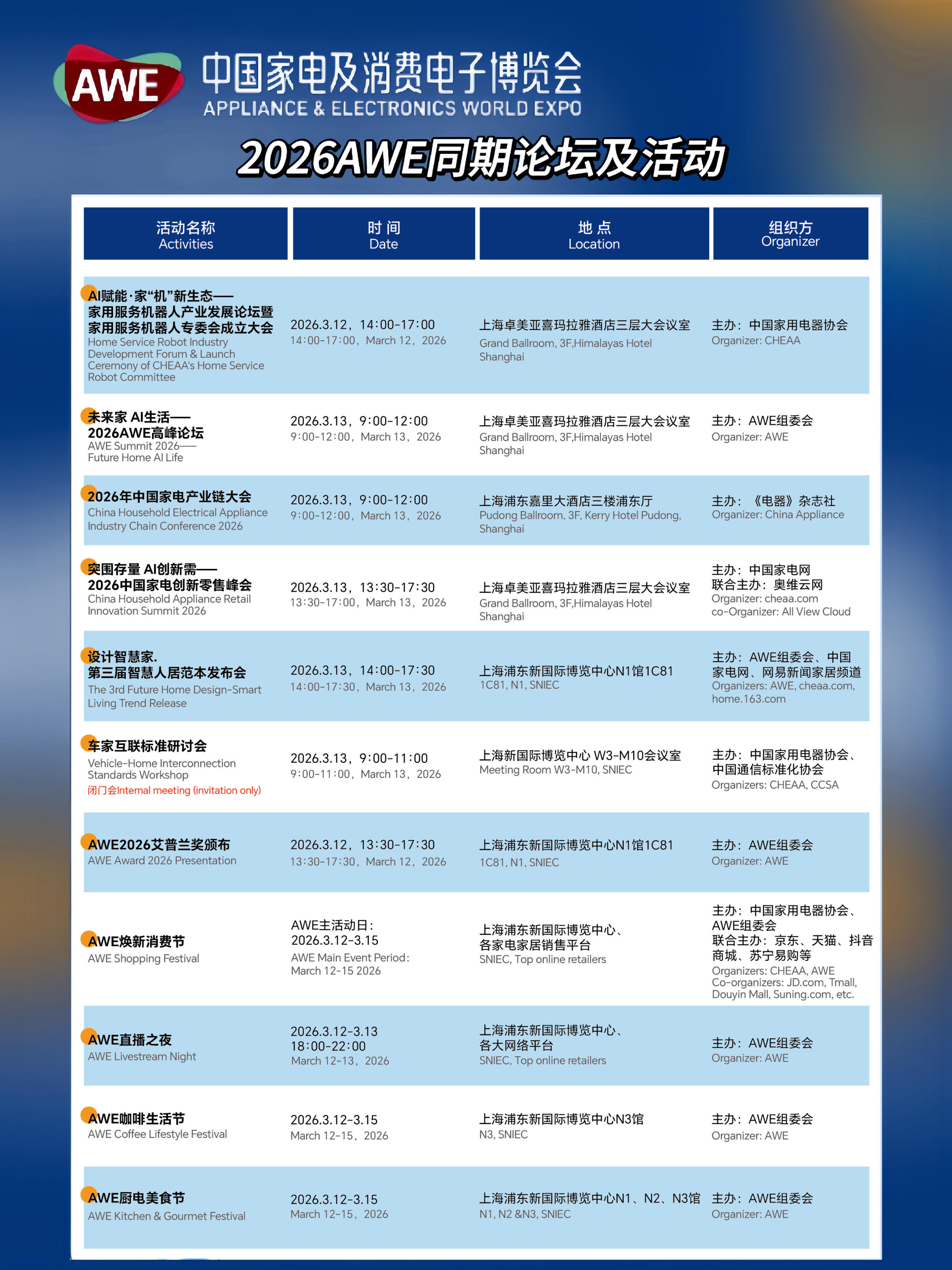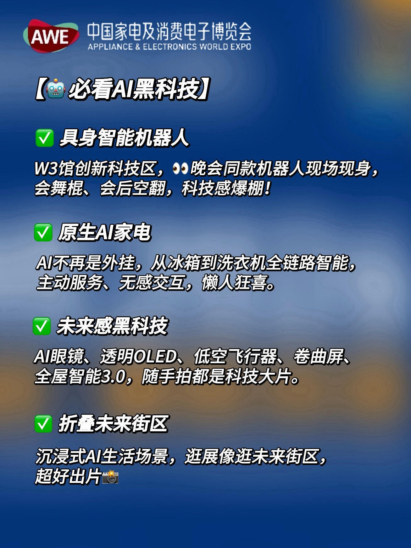 上海AWE2026保姆级攻略,这届中国家电及消费电子博览会(AWE)的主题是【AI科技 慧享未来】。不仅是家电及数码爱好者必打卡的科技盛会,更是美食爱好者的天堂!超全看展攻略整理好了,照着走不迷路。上海AWE一眼就能找到的那片红