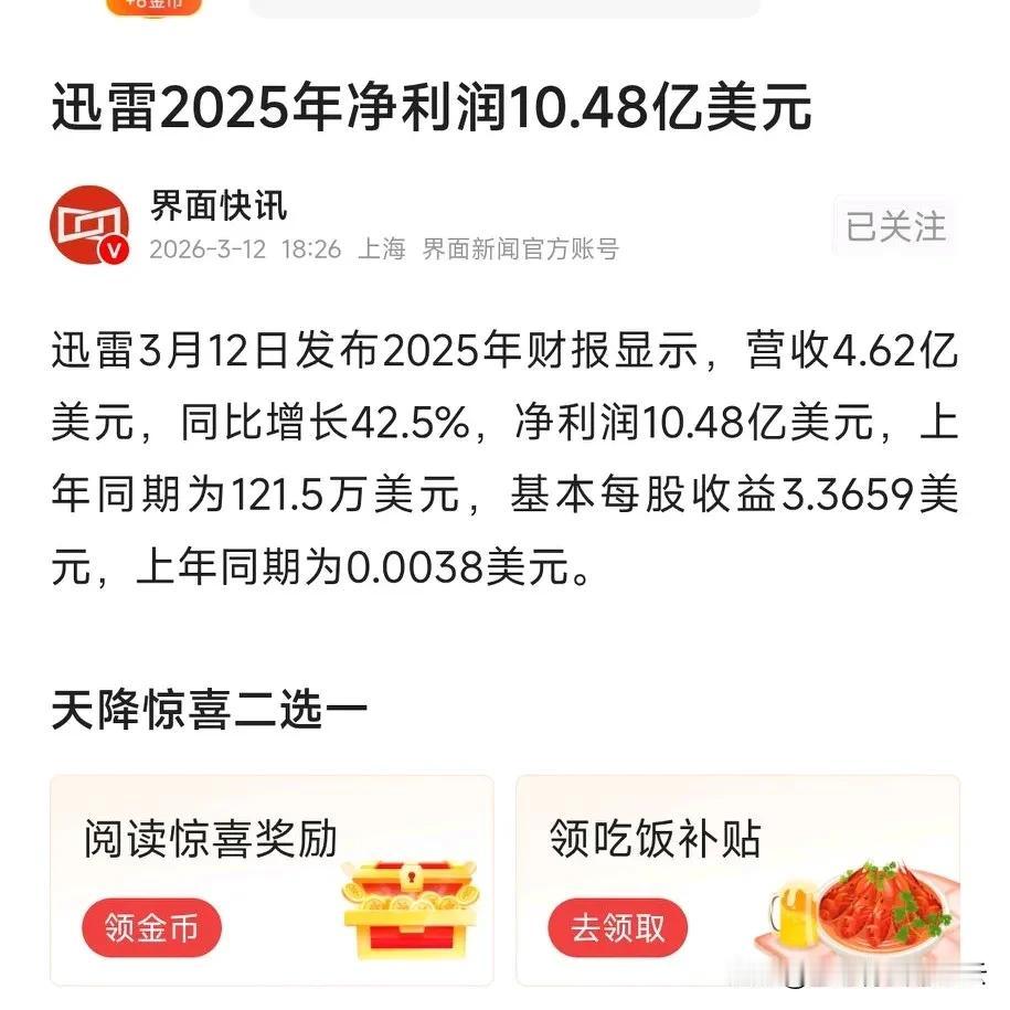 太惊讶了! 逐渐快要淡出公众视野的迅雷,突然公布2025年财报,显示2025年营收4.62亿美元(32亿人民币左右),净利润却是10.48亿美元(73亿人民币左右),利润是营收的两倍以上,很多人纳闷,它是如何做到利润比营收高两倍多的? 网传因它投资影石创新暴赚的,是否属实,迅雷没明说,大家说说,这其中有什么玄机?