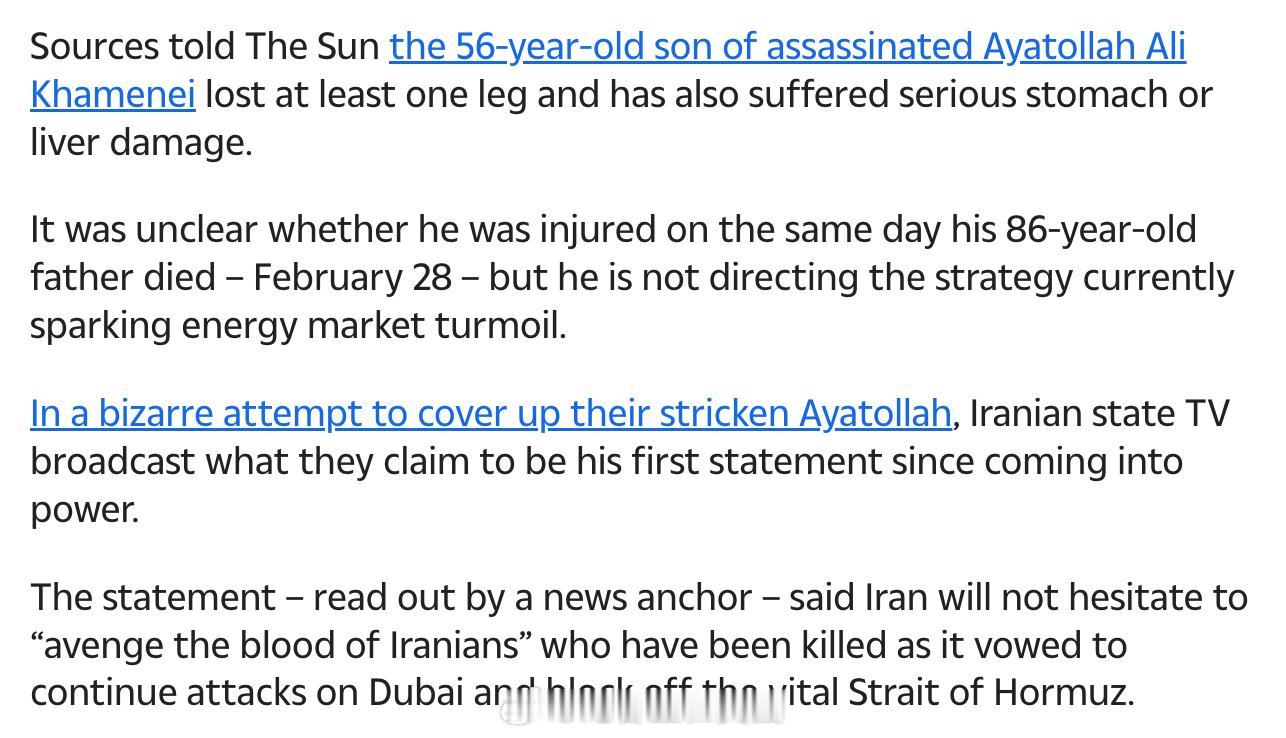 <太阳报>:新任最高领袖 Mojtaba已陷入昏迷,至少失去了一条腿,并且腹部或