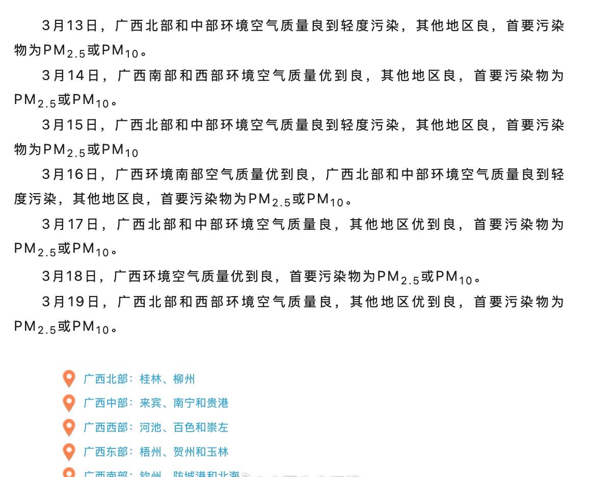 【广西未来7日空气质量预报】3月13日,广西北部和中部环境空气质量良到轻度污染,其他地区良,首要污染物为PM2.5或PM10。 3月14日,广西南部和西部环境空气质量优到良,其他地区良,首要污染物为PM2.5或PM10。 3月15日,广西北部和中部环境空气质量良到轻度污染,其他地区良,首要污染物为PM2.5或PM10。 3月16日,广西环境南部空气质量优到良,广西北部和中部环境空气质量良到轻度污染,其他地区良,首要污染物为PM2.5或PM10。 3月17日,广西北部和中部环境空气质量良,其他地区优到良,首要污染物为PM2.5或PM10。 3月18日,广西环境空气质量优到良,首要污染物为PM2.5或PM10。 3月19日,广西北部和西部环境空气质量良,其他地区优到良,首要污染物为PM2.5或PM10。