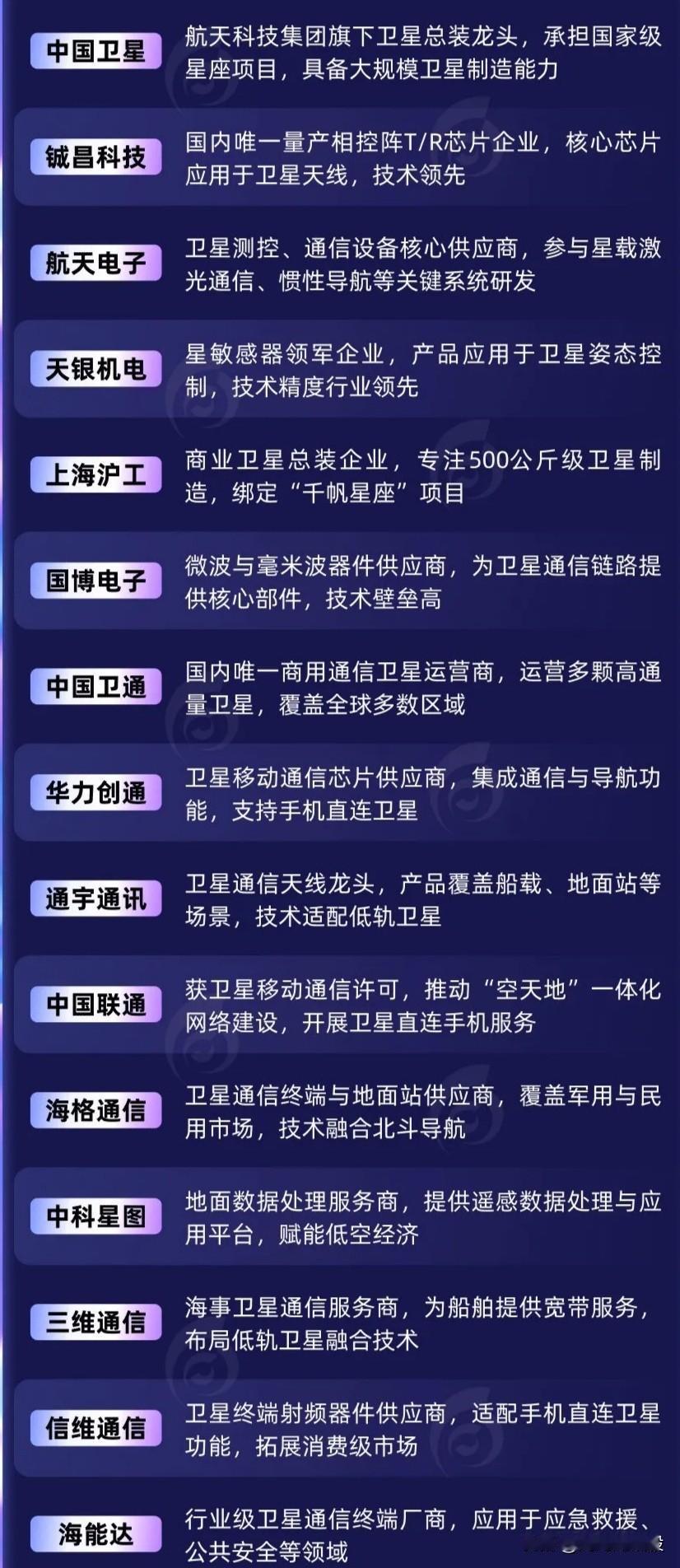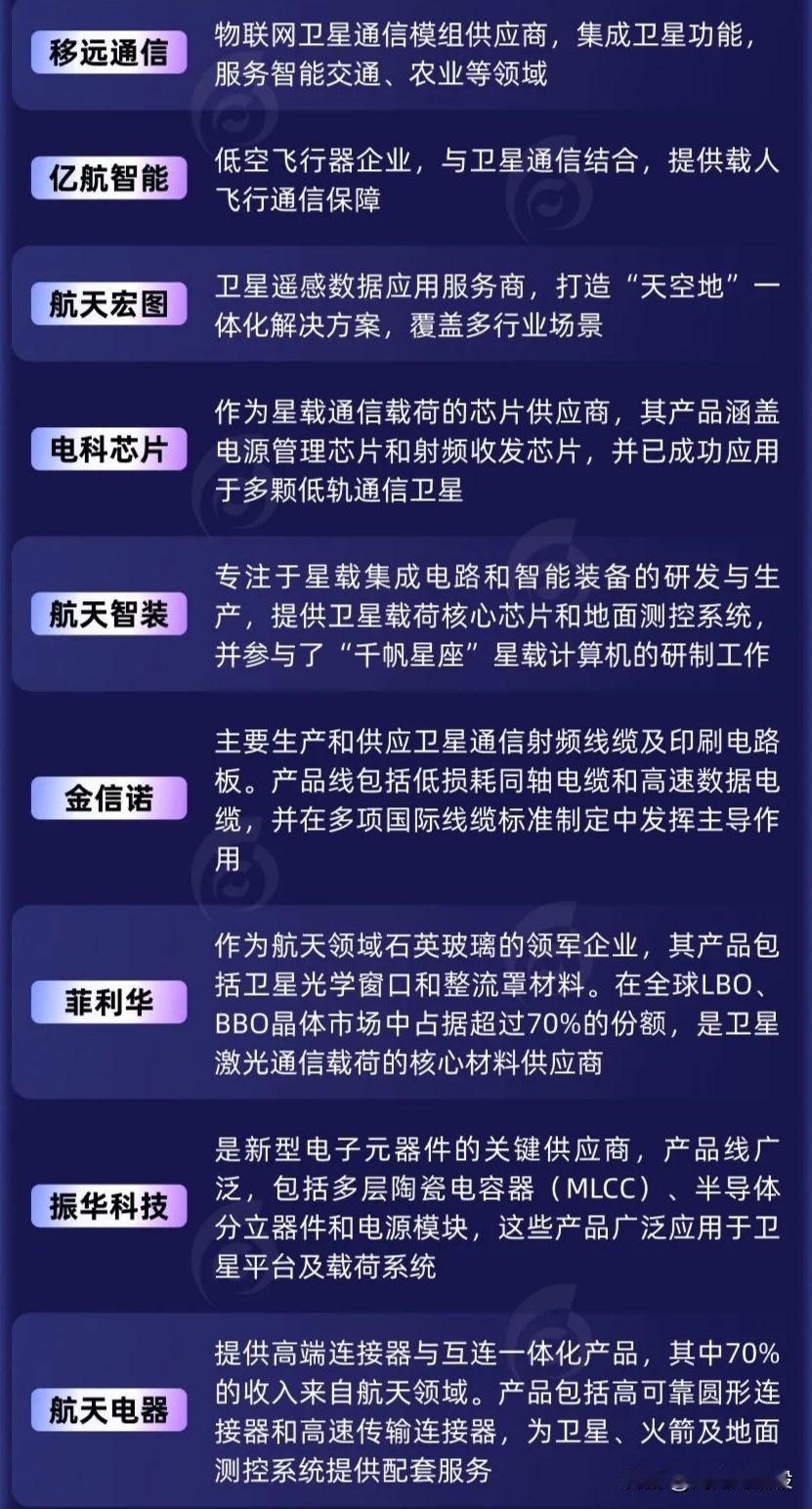 今日凌晨:卫星互联网赛道利好来袭! 我国成功发射卫星互联网低轨20组卫星和试验三十号卫星03、04星…… 卫星互联网赛道产业链核心龙头梳理如下。 关注“刘姥姥”,精彩分享真不少(麻烦亲们:点赞,收藏,分享)。 特别提醒:本文涉及内容及个股,仅供交流与参考,不是荐股,不得以此作为买卖依据,盈亏自负。航天卫星板块 卫星互联板块 卫星板块 卫星概念 卫星互联网投资 卫星互联网服务