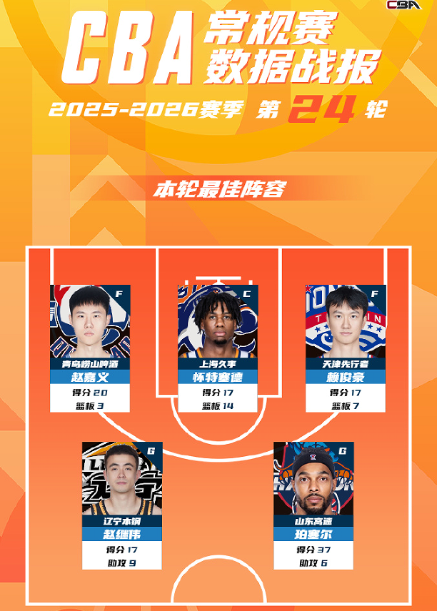 2025-2026赛季CBA联赛常规赛第24轮结束较量,来自青岛男篮的赵嘉义,上海男篮的怀特塞德,天津男篮的赖俊豪,辽宁男篮的赵继伟和山东男篮的珀塞尔入选CBA联赛常规赛第24轮最佳阵容!