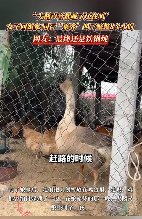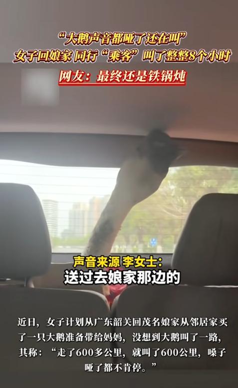 “哭笑不得!”近日,广东,一女子回娘家时,她老公从邻居家买了只大鹅带给妈妈,没想到从开车的时候,大鹅就开始叫,最后嗓子哑了都不肯停,到家后,女子本不想这么快吃掉大鹅,但因为大鹅声音太吵被邻居投诉,只能将它炖掉!网友:可能是太害怕了! 那天天气挺好,不冷不热,风也不大,特别适合回娘家。 她老公也是个有心人,觉得散养的比市场上买的肉质好、也干净,便一直琢磨着带点啥能让老人开心。 她老公路过邻居家院子的时候,正好看见邻居在给大鹅喂食,那几只大鹅嘎嘎叫着围过来,个个都胖乎乎的,看着就很有食欲。 他立马就动心了,凑过去跟邻居唠嗑,问能不能买一只。 邻居也是个爽快人,平时跟他们家关系就不错,二话没说就答应了,还特意挑了一只最大最壮的。 套好绳子之后,大鹅好像察觉到了不对劲,开始拼命挣扎,脖子使劲往回缩,嘴里还发出“嘎嘎嘎”的叫声。 她老公赶紧把大鹅抱起来,尽量安抚它,可这大鹅根本不买账,叫得更凶了,挣扎得也更厉害了。 女子在一旁看着,跟她老公说,要不别折腾了,别再被它啄到。 可她老公说,都跟邻居说好了,而且这大鹅确实好。 说着他就把大鹅放进了车的后备厢,还特意找了个纸箱,把大鹅放进去。 本以为放进纸箱里,大鹅能安分一点,可谁知道,车子刚发动,后备厢里就传来了大鹅的叫声。 一开始还是“嘎”“嘎嘎”的,一会儿一下,但不一会儿就变成了一声接着一声,没有半点停顿。 就这样,他们开了几个小时的车,这几个小时里,大鹅就一直这么叫着,没有休息过一分钟。 而大鹅的叫声越来越嘶哑,一开始清脆响亮的“嘎嘎”声,慢慢变成了沙哑的“嘎…嘎…”声。 听着都觉得费劲,像是嗓子被喊破了一样,可即便这样,它还是没有停下,依旧一声一声地叫着,只是声音越来越弱,越来越哑。 终于,车子开到了娘家。 可还没等他们好好打个招呼,妈妈就听到了车里传来的沙哑的鹅叫声。 她老公赶紧把大鹅从车里抱了出来,这时候的大鹅,已经没有了一开始的挣扎力气,只是有气无力地叫着。 女子的妈妈看了,打算先找个地方把它圈起来。 本以为大鹅在院子里缓一缓,就能安静下来,可谁知道,这大鹅到了院子里,非但没有安静,反而又开始叫了起来。 一开始,邻居还以为只是偶尔叫几声,也就没在意,可没想到,这大鹅从上午一直叫到下午,又从下午叫到晚上,严重影响了邻居的休息。 第二天有邻居实在忍不住了,就先上门来委婉地提了一下,说家里有老人和小孩,需要休息,这大鹅的叫声太吵了。 女子和她妈妈赶紧道歉,不停地跟邻居说对不起。 女子和家人本来想过段时间再吃它,可没办法,这大鹅的叫声实在太吵了,已经严重影响到了邻居的正常生活。 她妈妈也叹了口气,说只能把它炖掉了,不然一直这样下去,也对不起邻居们。 后来,女子把这件事发到了网上,还配文说了整个过程,很多网友都在评论区留言。 有网友说:“鹅的胆子本来就小,被抓来抓去,又长途奔波,肯定是吓坏了,所以才会一直叫,哪怕嗓子哑了也不停,这是它们表达恐惧的方式。” 还有网友说:“看着有点心疼这只大鹅,它只是太害怕了,可没办法,现实就是这样,最后还是没能逃过被炖掉的命运。” 还有网友分享自己的经历,说自己以前也买过大鹅,也是这样,从买回来就一直叫,叫到嗓子哑,最后没办法,只能赶紧炖掉,不然真的会被邻居投诉。 (信息来源:青岛晚报《连叫8小时!“嗓子哑了都不肯停”!女子开车600公里带鹅回娘家,鹅叫了一路,到家又叫被邻居投诉:第二天被炖》)