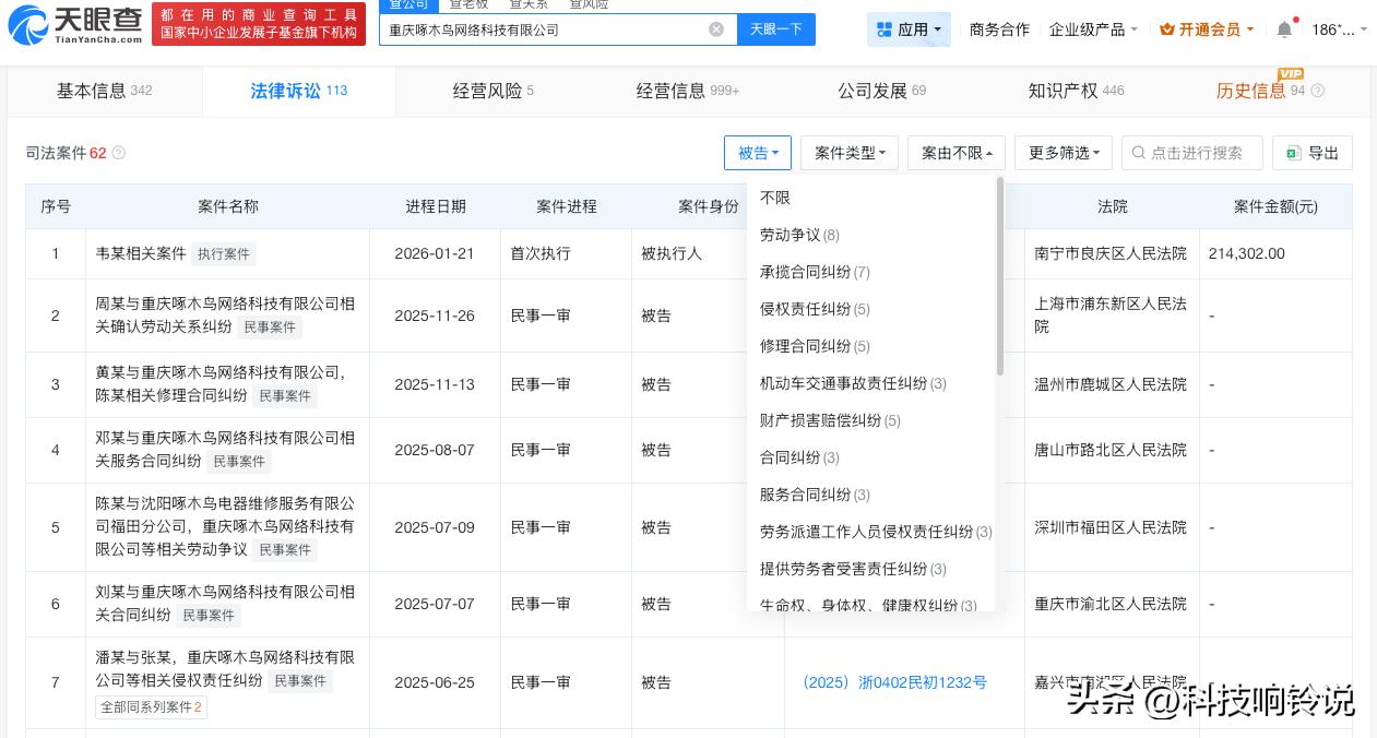 【去年315曝光家电维修不合理收费企业现状 去年315曝光家电维修不合理收费企业被执行】 去年3月15日,央视3·15晚会曝光家电维修的收费玄机问题,重庆啄木鸟网络科技有限公司被点名。一年后,被曝光的企业现状如何? 天眼查工商信息显示,重庆啄木鸟网络科技有限公司成立于2014年12月,法定代表人为王国伟,注册资本约2409万人民币,经营范围包括家电安装、维修、清洗及相关技术服务等。股东信息显示,该公司由重庆啄管家科技有限公司、王国伟等共同持股。风险信息显示,此前,该公司曾被执行约21.4万元。此外,该公司涉及多起法律诉讼,案件身份多为被告,案由包括劳动争议、承揽合同纠纷、侵权责任纠纷、修理合同纠纷等。 天眼查信息: