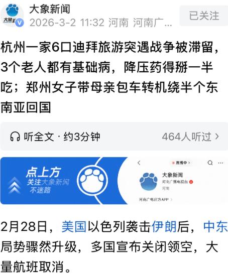 “来的时候好好的,却回不去了……”浙江杭州,女子一家六口去迪拜度假,原计划3月1号回国,却因为战争滞留了,女子这下头大了,家里3个老人都有基础病,带的药马上就吃完了,如今降压药都得掰成一半吃,一想到老人可能要面临没药可吃的困境,女子就忧心忡忡…… 出发之前,王女士也刷到过中东局势不太稳定的新闻,但那时候大家都觉得,战火离迪拜还很远,这么一个热门的旅游城市,怎么也不会被波及。 加上三位老人年纪大了,平时很少出门,这次好不容易说动他们出来,王女士也不想让老人们失望,就抱着侥幸心理,按时带着一家人出发了。 刚开始的几天,一切都好好的,他们去了哈利法塔,逛了迪拜购物中心,还带孩子去了商场里的溜冰场,老人也跟着凑凑热闹,脸上都挂着难得的笑容。 那天下午,他们一家还在迪拜购物中心里闲逛,老人陪着孩子在溜冰场边上玩耍,王女士正和丈夫商量着晚上去吃当地的特色美食,突然就听到了“咚咚咚”的闷响。 一开始大家都没在意,以为是商场里的施工声音。 但孩子的外公脸色一下子就变了,拉着孩子往王女士身边靠,说那声音不对劲,像是炮声。 王女士当时还觉得外公太敏感,但直到手机里突然弹出防空警报的提示音,周围的人开始慌乱起来,商场里的广播也响起了紧急通知,他们才意识到,真的出事了。 回到了酒店后,手机里的防空警报响了一次又一次,窗外偶尔能看到远处传来的微光,偶尔还能听到隐约的爆炸声,那种未知的恐惧,让每个人都心有余悸。 王女士的婆婆本来就胆子小,吓得一直紧紧抓着她的手,嘴里不停念叨着要回家。 王女士强装镇定,安慰着老人和孩子,可心里早就乱成了一团麻,她打开手机查回国的航班,才发现所有航班都被取消了。 不仅如此,后续好几天的航班也全部显示取消。 最关键的是,三位老人都有基础病,当时想着能按时回国,根本没多带药品。 可现在滞留已经好几天,药品早就告急,原本每天降压药吃一片的剂量,现在只能掰成一半吃。 王女士每天都在想办法找药,她也尝试过联系酒店工作人员帮忙,可得到的回复都是暂时没有这些药品,让她再等等。 他们一家还通过媒体,向其他滞留的同胞求助,如果有人手头有富余的药,希望能匀一点给他们,哪怕一点点,也能解燃眉之急。 与此同时这段时间,王女士和丈夫每天都在刷机票、找药品,几乎没怎么合过眼。 他们也尝试过改签航班,最后只能勉强改到3月4号,让三位老人带着孩子先回国,自己和丈夫则改到3月6号。 可就算这样,他们心里还是没底。 三位老人都不会说英语,带着一个孩子,在战火未熄的情况下,能不能顺利登机、顺利回国,都是未知数。 有时候看着老人因为药量减半,偶尔出现头晕、乏力的症状,王女士就特别后悔,要是当初能多带点药,要是当初能重视局势新闻,就不会让老人们遭这份罪。 和王女士一家的无助不同,郑州的姜女士,已经带着母亲踏上了曲折的回国路。 姜女士和母亲是2月25号去的迪拜,本来计划3月3号回国。 但到了3月1号,姜女士看着局势越来越紧张,领空关闭,航班取消,心里一下子就慌了。 她知道不能再等了,必须赶紧想办法回国,不然一旦局势进一步恶化,就更难走了。 那天凌晨,姜女士几乎没合眼,一直守在手机前抢机票,手指都快戳破屏幕了,终于抢到了一张迂回航线的机票——先从阿曼飞往巴厘岛,再从印尼转机到越南,最后从越南飞回国内。 这条航线几乎绕了半个东南亚,光飞行和中转的时间就要好几十个小时,而且机票价格涨得离谱,比平时贵了好几倍。 但姜女士根本顾不上这些,只要能回家,再折腾、再贵都值得。 抢到机票后,新的问题又出现了,怎么从迪拜去阿曼? 因为领空关闭,只能走陆路,而当时迪拜到阿曼的包车已经变得非常紧张,价格也翻了好几倍。 姜女士好不容易才订到一辆车,一行五个人,花了4300迪拉姆,折合人民币大概8000多块钱。 出发去阿曼的那天,姜女士和母亲早早地就收拾好了行李,心里既紧张又期待。 车子在公路上疾驰,沿途的气氛很紧张,同行的人都紧紧盯着手机,关注着局势新闻,没有人说话,直到车子缓缓驶过边境线,进入阿曼境内,大家才不约而同地长舒了一口气。 (信息来源:潮新闻、大象新闻《杭州一家6口迪拜旅游突遇战争被滞留,3个老人都有基础病,降压药得掰一半吃;郑州女子带母亲包车转机绕半个东南亚回国》)